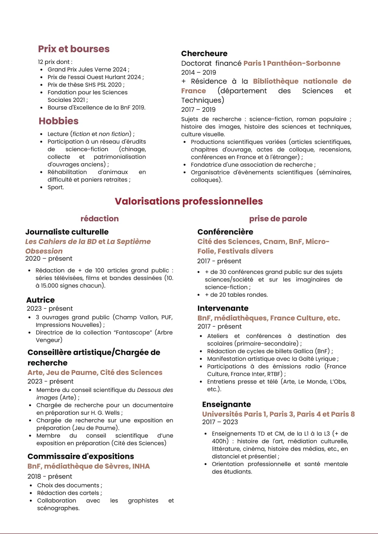 Journaliste culturelle pour la presse papier (cinéma, BD, série, culture pop) + autrice (Champ Vallon, PUF, Impressions Nouvelles) ;