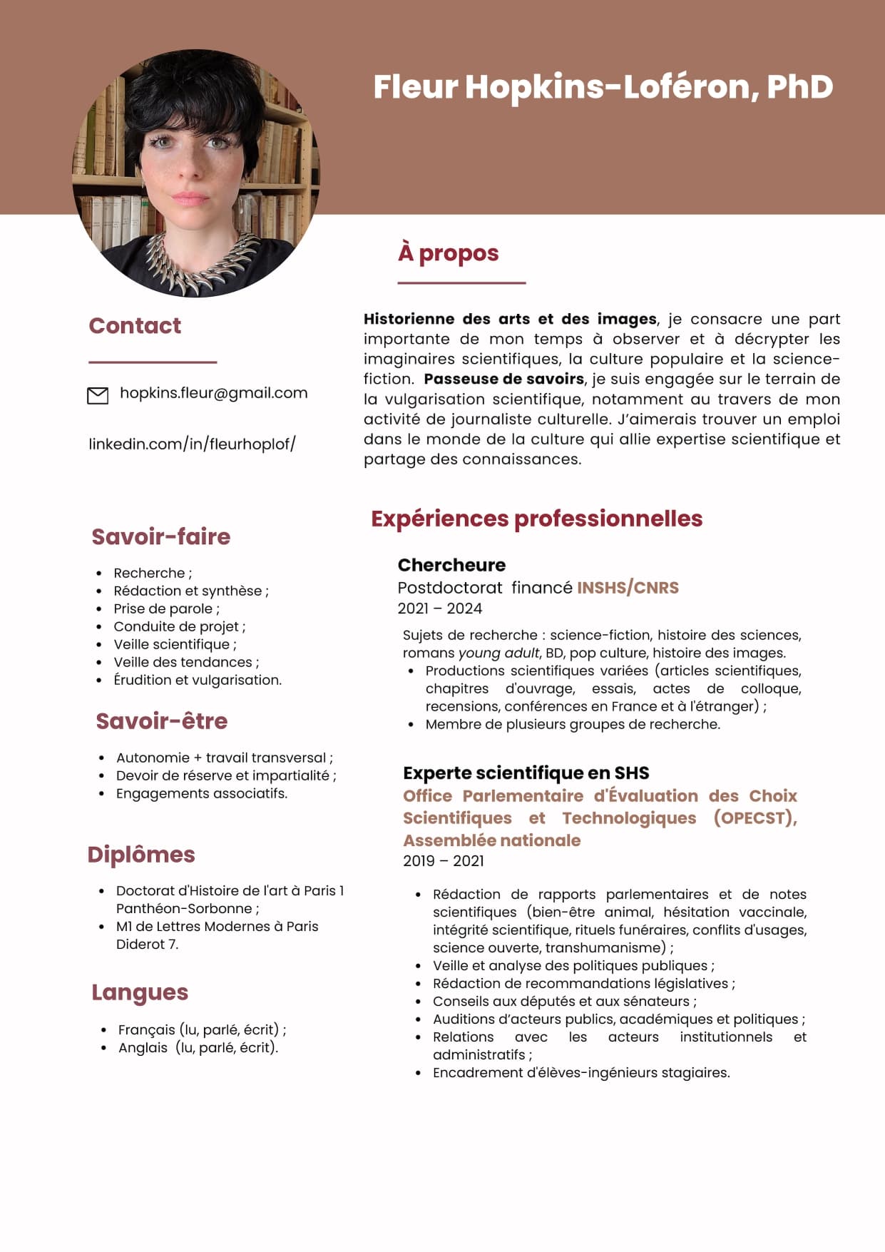 Vous pouvez me retrouver sur LinkedIn (fleurhoplof), où se trouve aussi sur ma page un cv détaillé axé recherche, ou me contacter par mail : hopkins.fleur@gmail.com