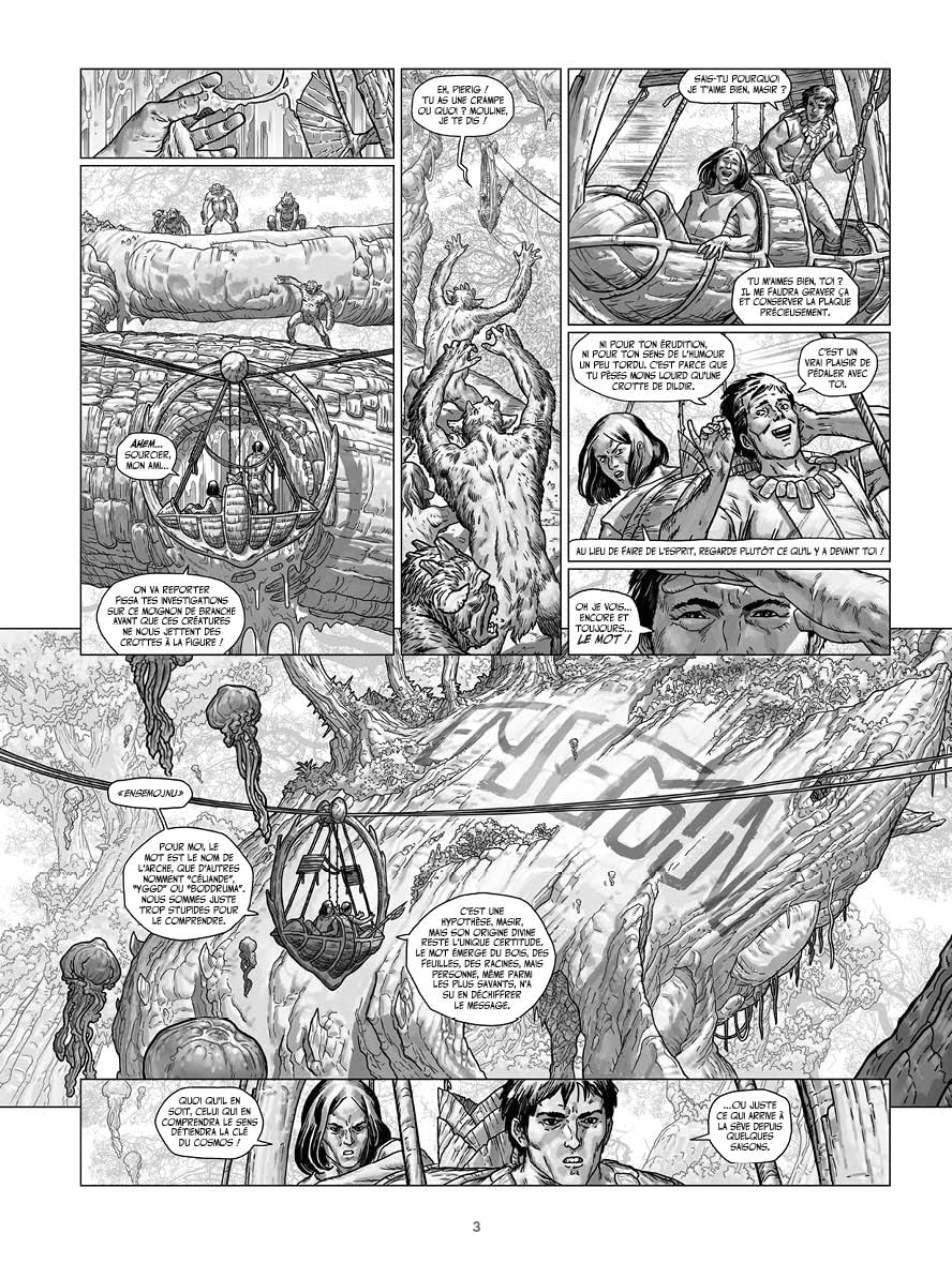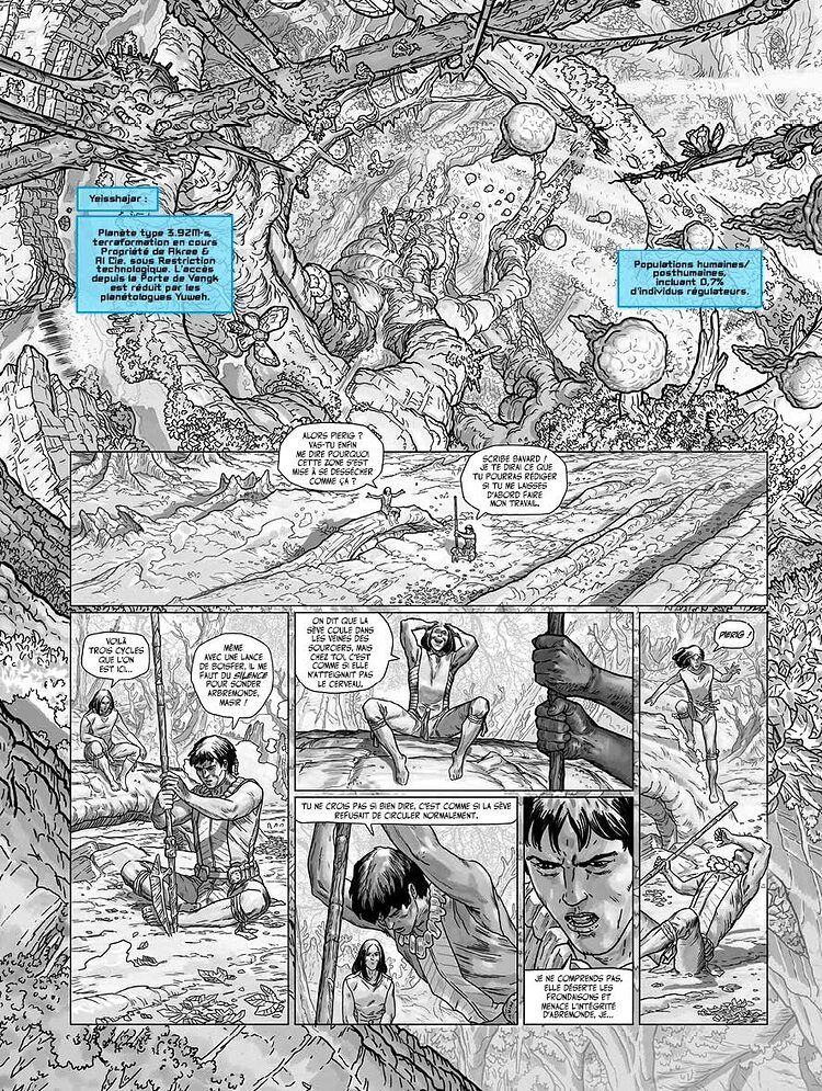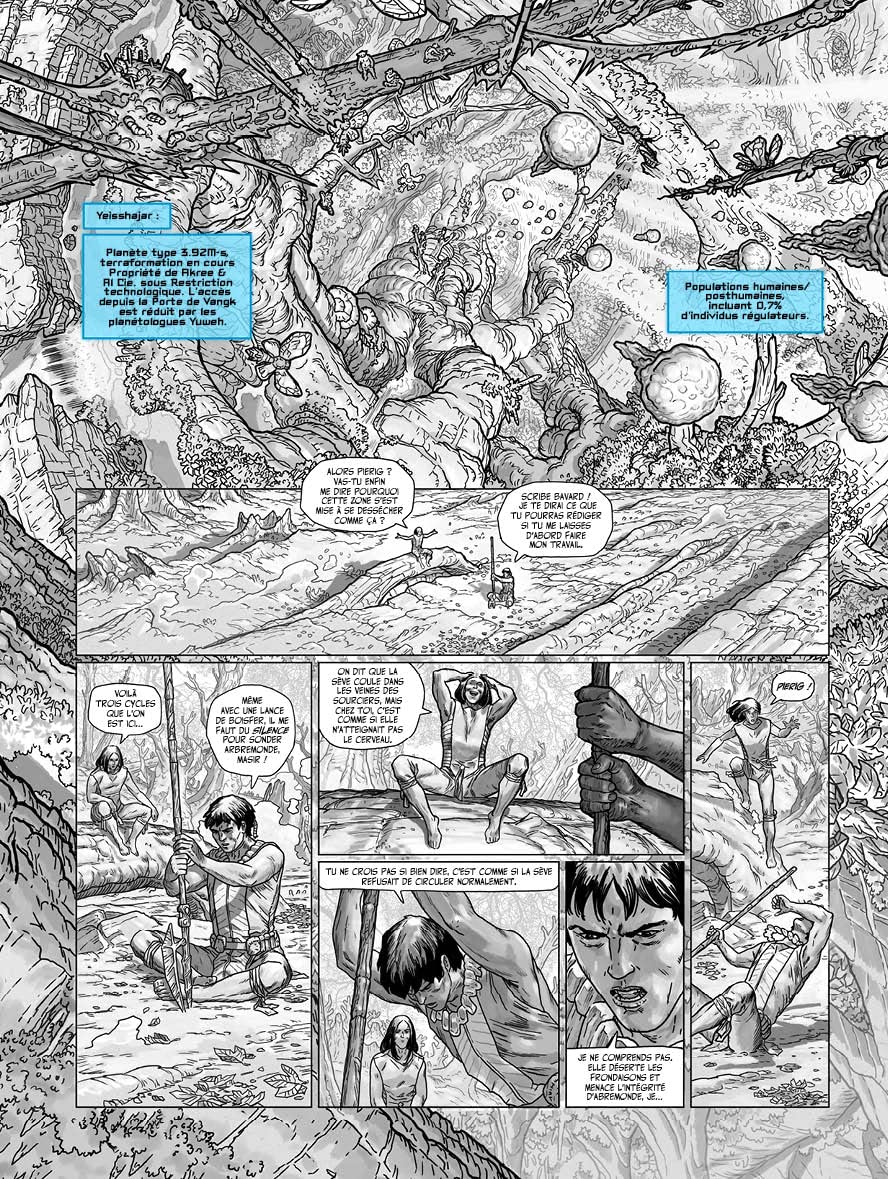 Les gigantesques branches de l’Arbre-monde hébergent tout un ensemble de clans, tel celui des chasseurs de sève. Lorsque Pierig est capturé par ce clan belliqueux, il comprend que ce sont ses dons de sourcier qui les intéressent. En effet, l’Arbre-monde se meurt et sa sève nourricière avec lui… Accompagné de trois guerriers, Pierig est contraint de trouver l’origine du mal qui ronge le titan végétal, jusqu’au pied de l’arbre s’il le faut. Mais à l’issue de ce dangereux périple, ses certitudes risquent d’être bousculées.