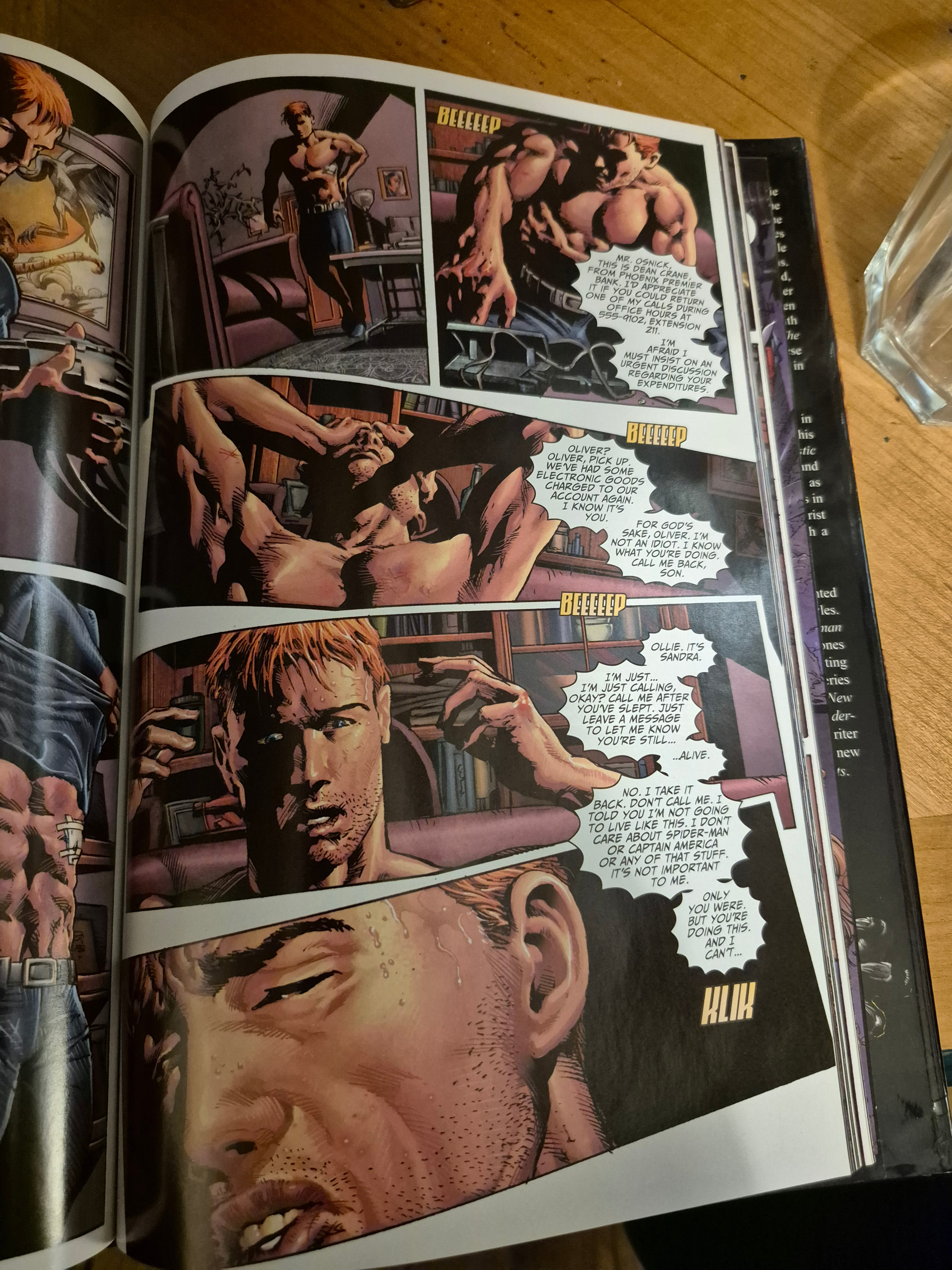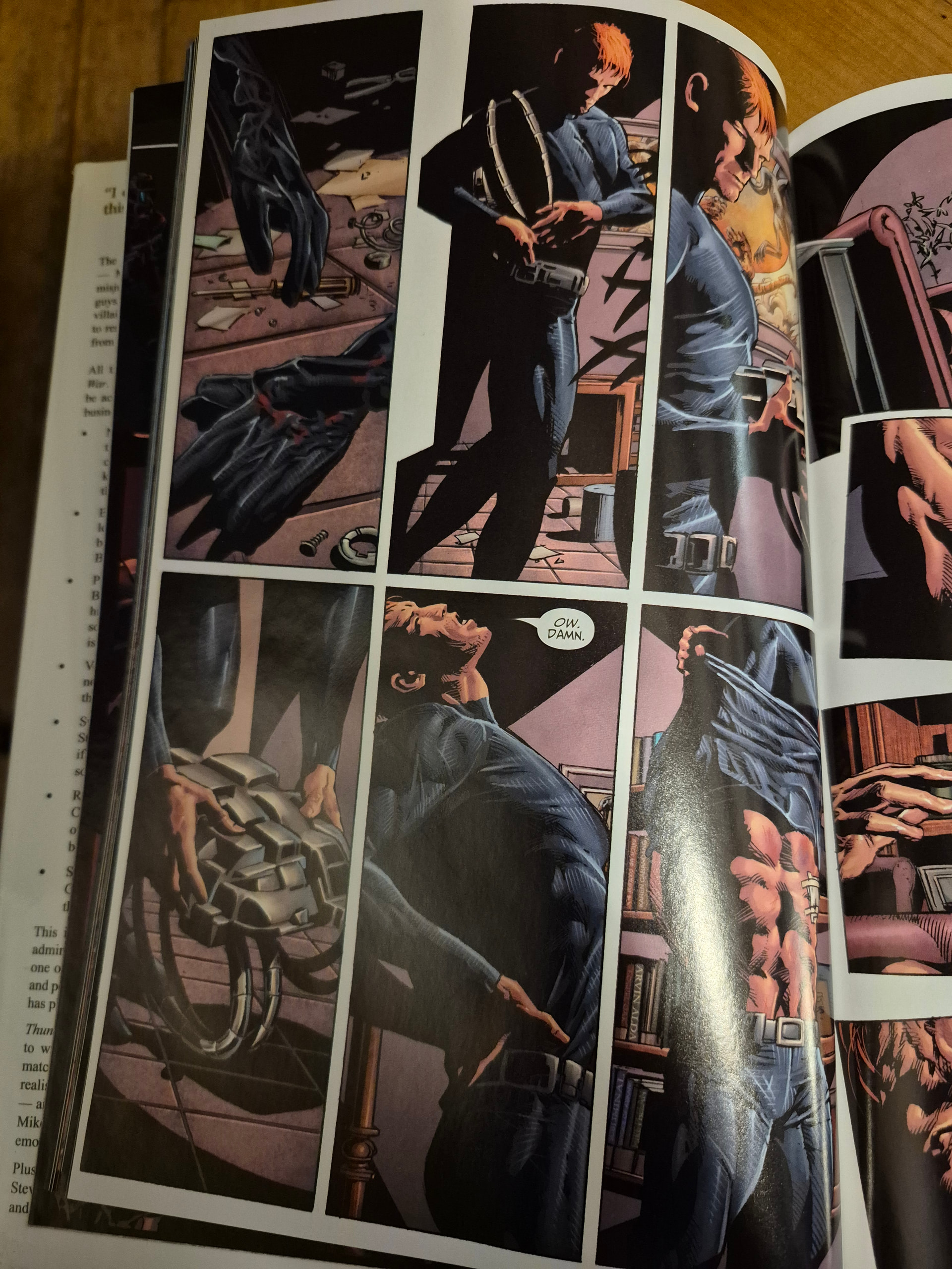 Et c est tout à fait conscient de la part d Ellis qui s amuse ici à pousser les potards de cette narration singulière. Ralentissement du temps, focus sur l avant ou apres action et les éléments quotidien, chiant, non super heroique du super heros. Sérieux, 5 pages pour rentrer chez soi et ecouter le répondeur ? Il parodie là.