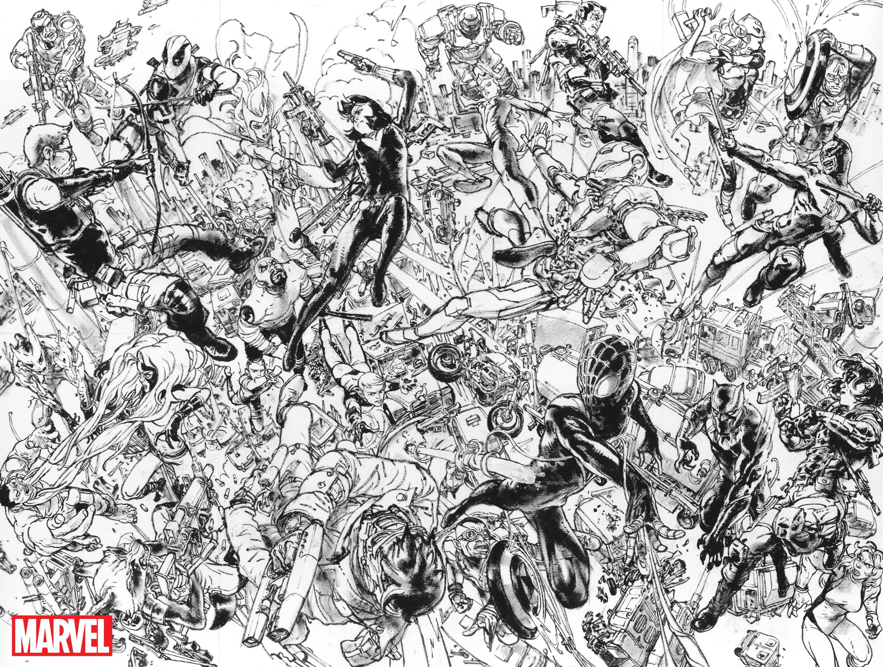 L’artiste sud coréen Kim Jung Gi (Spygames) fait ses débuts chez Marvel en illustrant les huit couvertures alternatives de la saga Civil War II. Une fois connectées entre-elles, ces illustrations forment un panorama fouillé comme vous pouvez le constater ci-dessus.