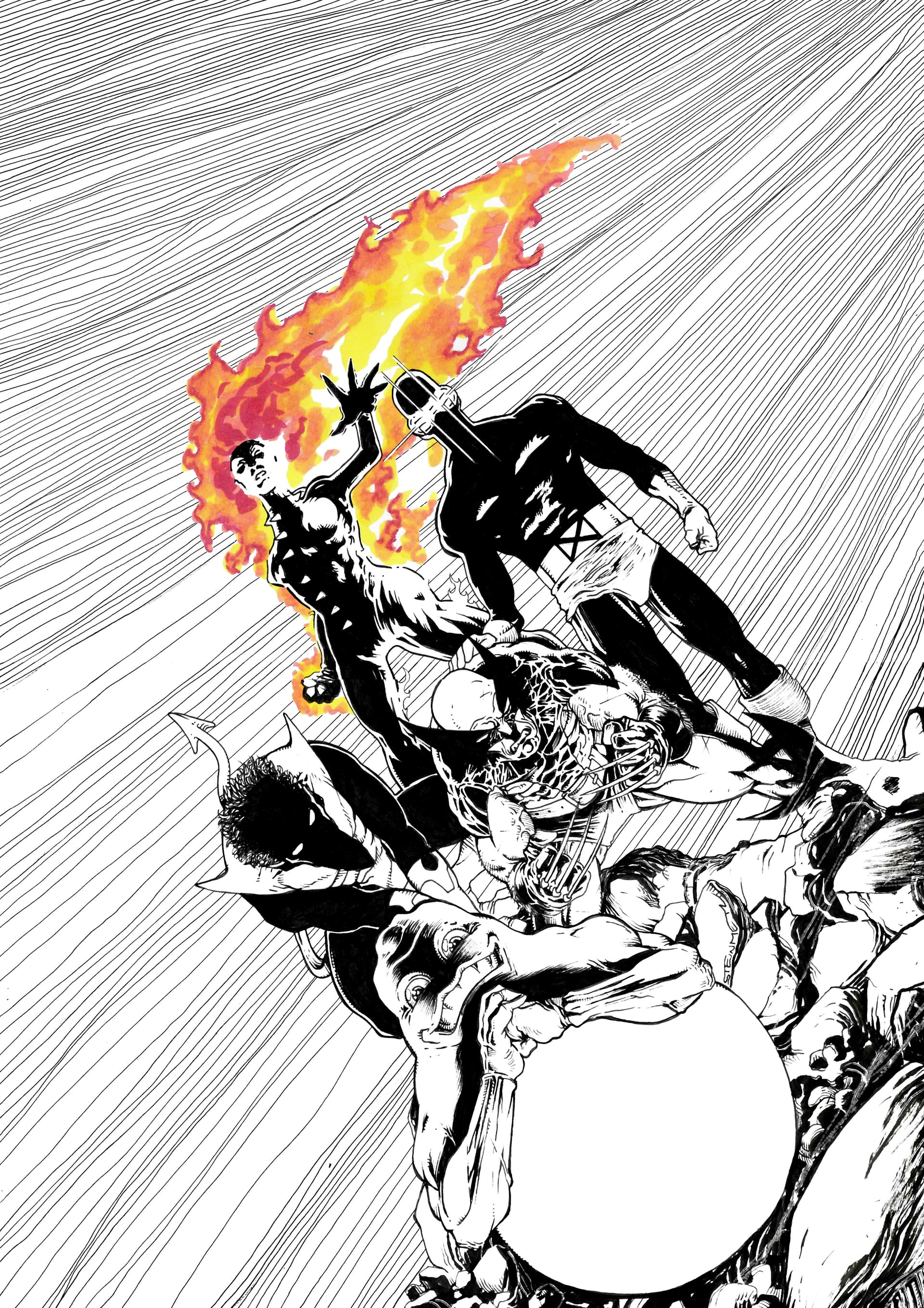 L’intérieur aux feutres, ça va, c’est le traçage des contours au noir qui me gêne. Déjà, je le traiterais au pinceau, afin d’avoir un rendu plus chaotique. Ici, j’ai gardé l’esprit de l’époque, avec une représentation classique (à la Torche humaine en quelque sorte ), mais aujourd’hui, j’aurais mis un calque d’addition qui transforme ces contours noir en rouge.