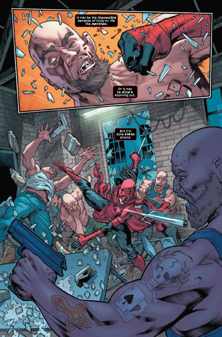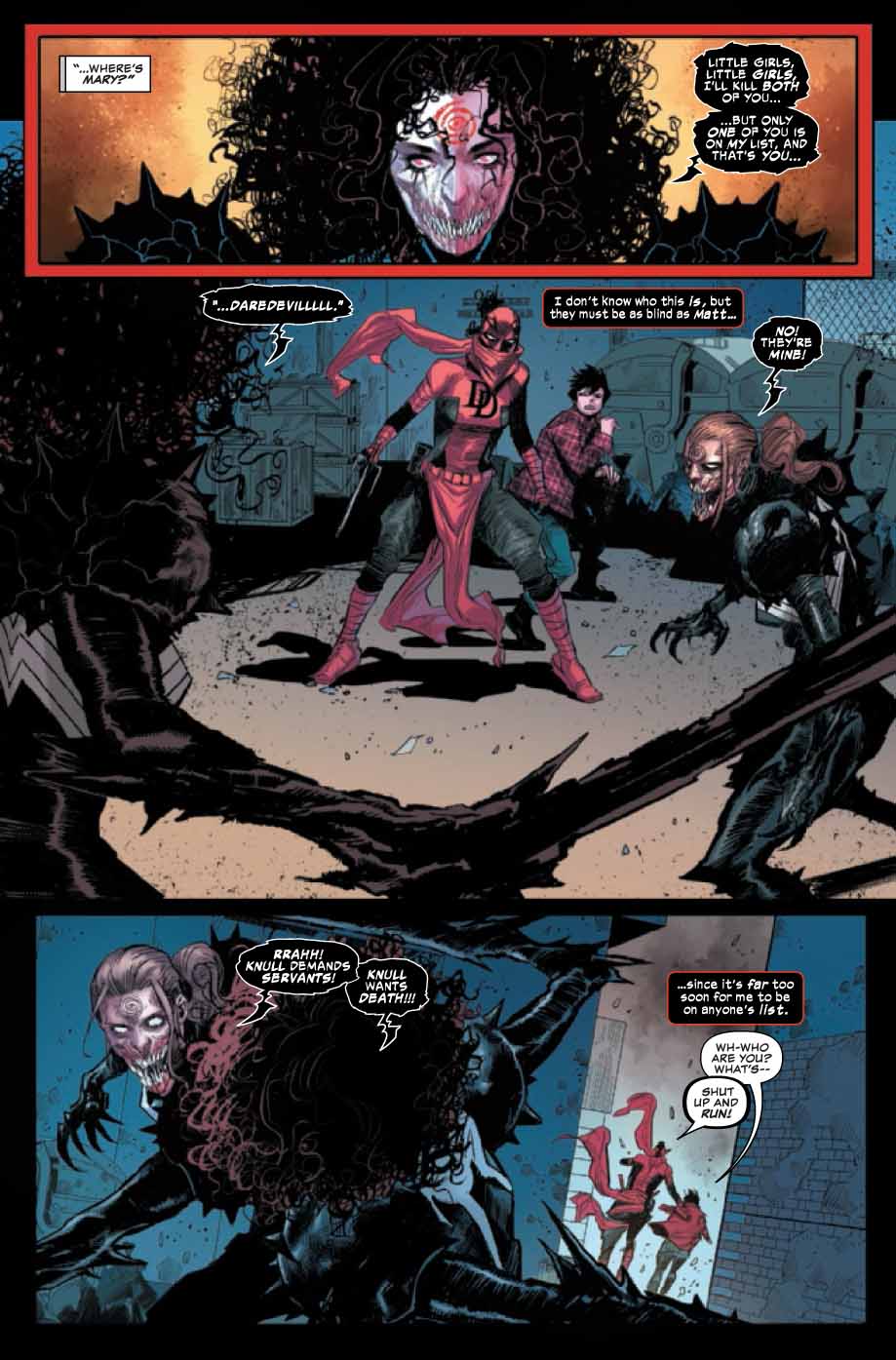 Matt, pardon Daredevil est en prison, et ça ne se passe pas super, même si ça explose quand les symbiotes arrivent. Elektra prend sur elle pour jouer à Daredevil, et gère difficilement la crise alors que Typhoid Mary, nouvelle garde du corps du Maire Wilson Fisk, l’attaque en étant Venomisée. Même sort pour Matt en prison, qui finit par céder à l’influence de Knull.