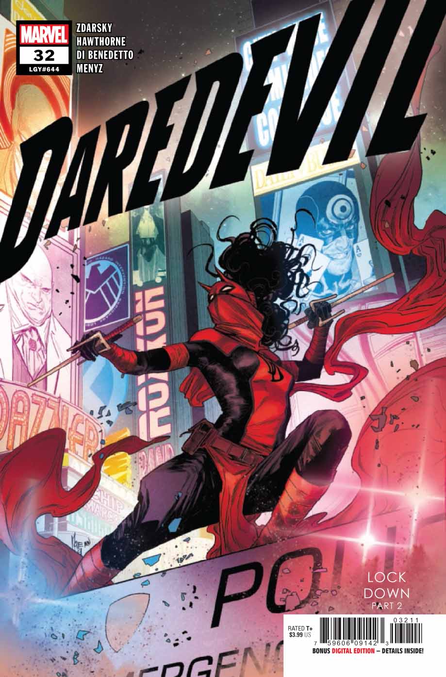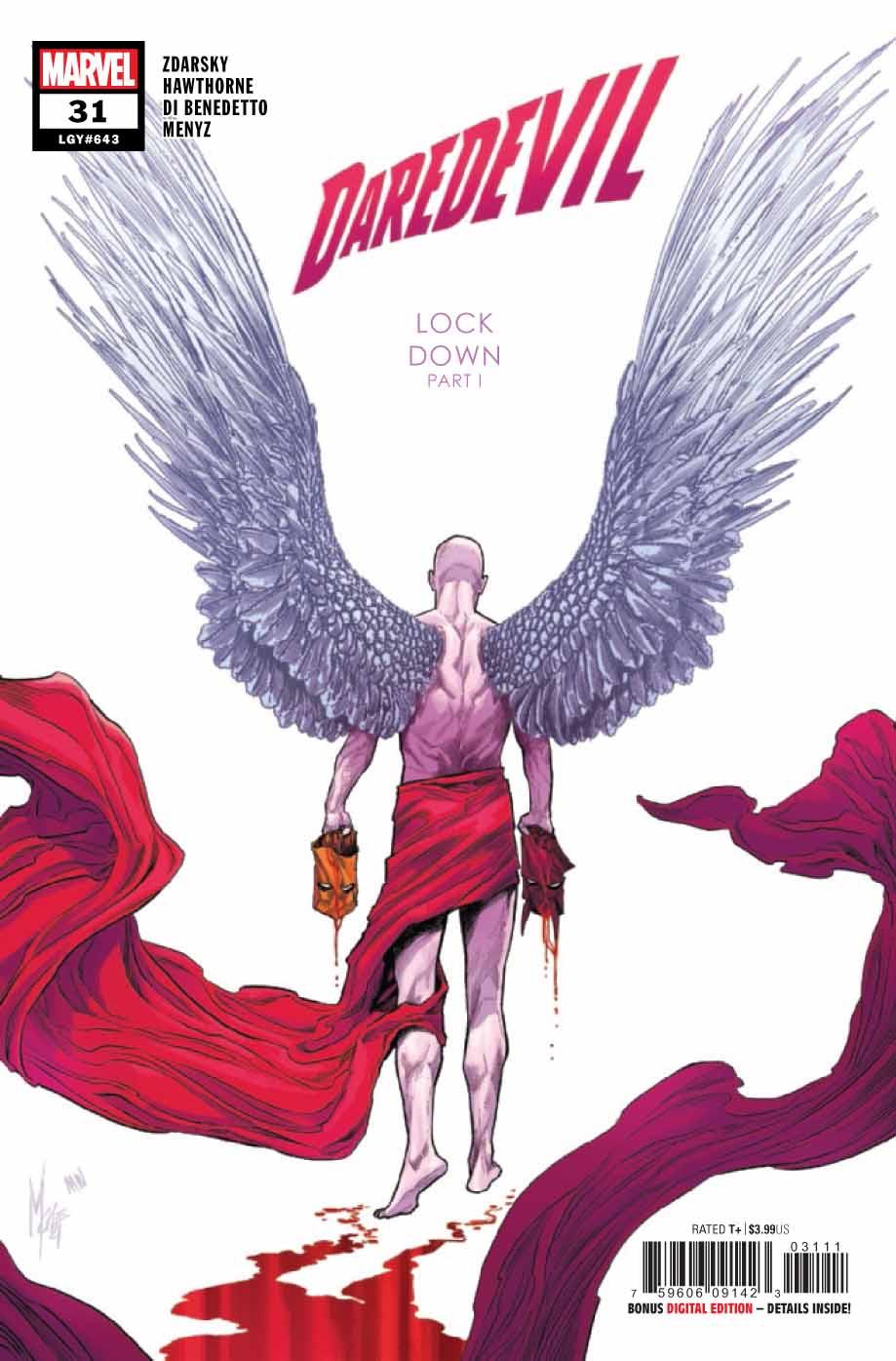 Description: « Lockdown » starts here! The Angel of Death has come to Hell’s Kitchen and New York City. A series of grisly murders tests Elektra’s mettle and commitment to her role as the new Daredevil, as the city spirals in a state of near panic. Meanwhile, Matt Murdock faces tests and challenges of his own, as the inmates he’s serving time alongside aren’t the ones in the prison targeting him…