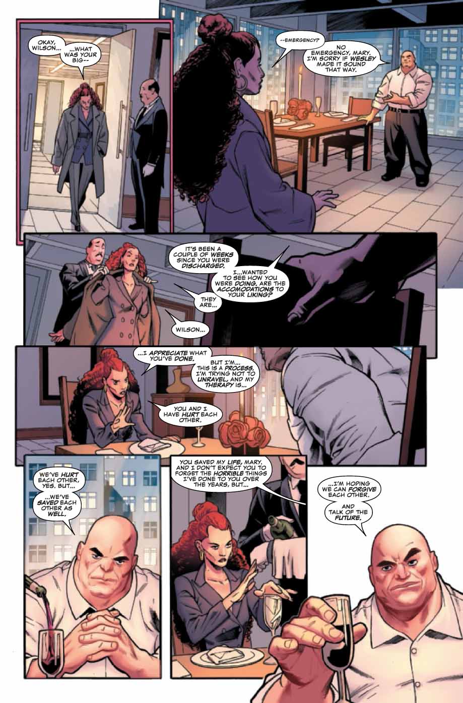 Chip Zdarsky poursuit le tie-in sur King in Black, en divisant l’action en trois. D’une part, Elektra/Daredevil lutte contre une Typhoid Mary Venomisée, mais qui garde le contrôle pour détruire Elektra ; pas mal, efficace, et on voit les différences entre Elektra et Matt. De l’autre, ledit Matt lutte contre l’influence de Knull, avec des méthodes extrêmes ; une approche un peu bateau de Matt et de la religion, mais ça fonctionne. Enfin, et pour le mieux, Wilson Fisk décide d’assumer ses responsabilités de Maire, après avoir fermé les yeux sur les alertes des super-héros.