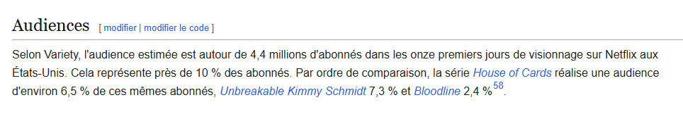 A savoir que quand tu lis l’article de Variety (2015) il s’agit d’une estimation basé sur un calcul maison, basé sur la vision d’un unique épisode. C’est intéressant mais on est loin des mesures d’audiences rigoureuses qui ont perduré durant des décénies pour les networks et qu’on retrouve aujourd’hui du fait de l’arrivée de la pub sur les services de SVOD. De plus il commet une erreur grossière en estimant que les chiffres ont justifiés la mise en route rapide de la deuxième saison alors qu’on sait très aujourd’hui (et même à l’époque de mémoire) que la société financé toujours deux saisons à la base.