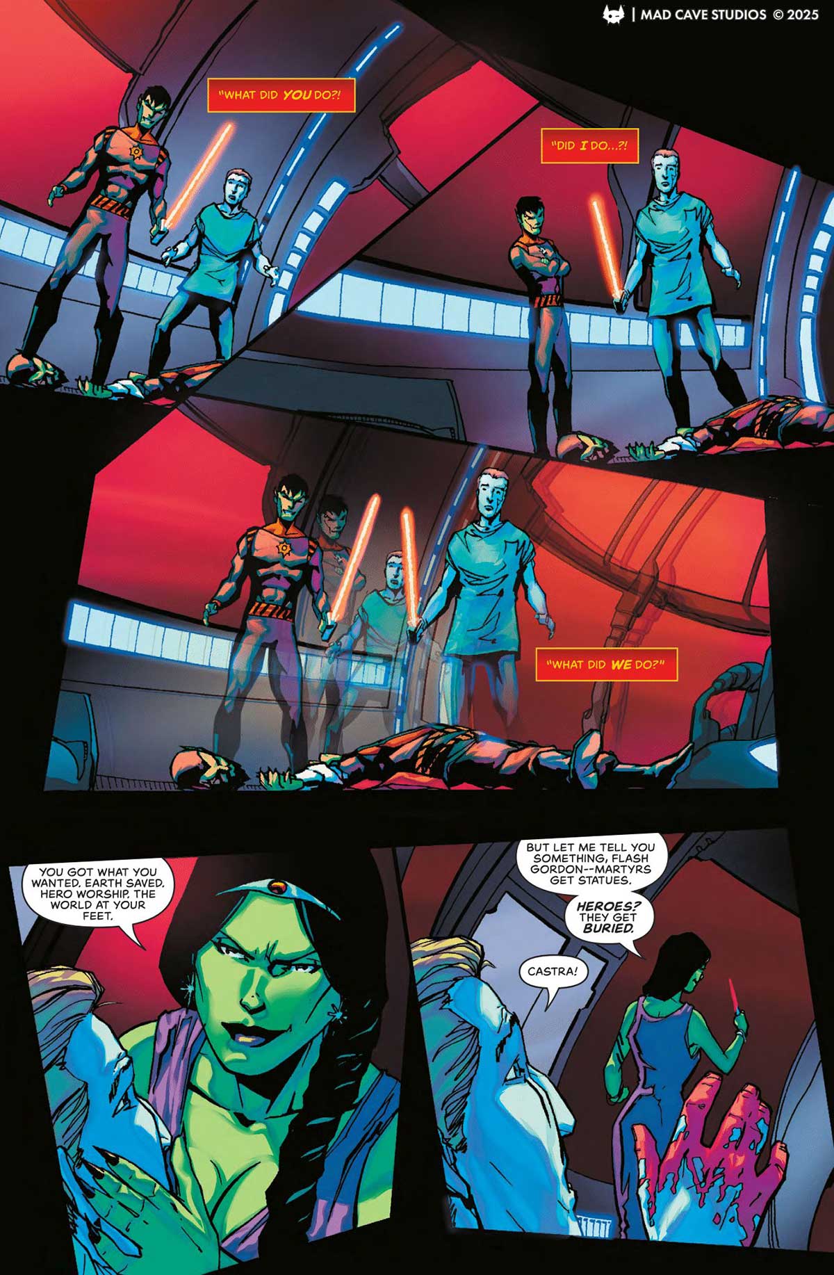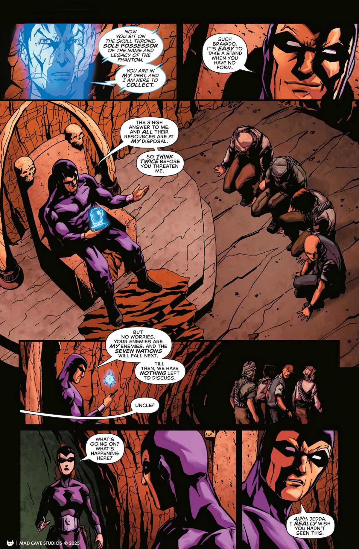 Dan DiDio poursuit ici un bon récit, avec de bons éléments. Nous sommes un mois après le #1, avec Lothar et L.J. dans leur territoire des Seven Nations où ils répondent à un appel à l’aide. Ils voient un chauffard errer brutalement dans les bois, le confrontent et voient qu’il est un Pirate Singh. Ils sont interpellés par Kurt Wagner, frère du Phantom et qui a désormais repris son rôle, son costume et son nom. Kurt refuse de céder et tue le Pirate devant Lothar, avant de s’enfuir. Lothar et L.J. le poursuivent, mais découvrent que le village qu’ils devaient aider a brûlé, avec en réalité quantité de cadavres de Pirates Singh. La vérité éclate quand Jedda, fille du Phantom et portant un costume, révèle qu’elle a aidé les villageois avant de les protéger avec son oncle, qui l’entraîne comme son héritière alors que son père refusait, restant au serment « de fils en fils ». La confrontation entre L.J. et Jedda est rude. En parallèle, Rick accompagne son père Flash Gordon et Kshin dans la forteresse glacée de Ming, reprise par son fils Krotan qui aide le monde. Rick voit quantité de gens ici, Kshin indique qu’ils seraient « volontaires » mais Rick en doute avec la vision d’un SDF qu’il avait croisé, mais Kshin dévie son esprit en révélant la survie et le retour de Zuffy, la petite créature rigolote. Enfin, Mandrake mène des spectacles dans des endroits bas de gamme, accompagné du Phantom, qui est surpris de son choix. Mandrake révèle qu’il « sent » quelque chose, il lui semble que plusieurs criminels disparaissent mystérieusement et ceux qui sont encore là ont tous une approche apathique et égocentrique des choses, comme l’essentiel de l’Humanité grâce aux « cadeaux » de Krotan. Ils sont attaqués dans la rue par des spectateurs dont Mandrake s’est moqué, le Phantom est blessé mais les stoppe même si l’on découvre ensuite qu’il semble être un vrai « fantôme qui marche » car il a soudain une allure spectrale, ce qu’il dit connaître depuis cinq ans et la fin de la guerre !