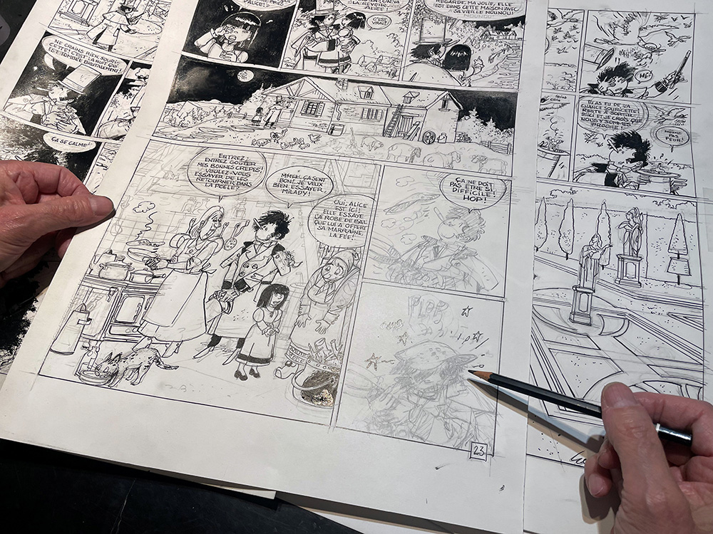 Des crêpes ! … Des Crêpes ! 𝐃𝐞𝐦𝐚𝐢𝐧, 𝐜’𝐞𝐬𝐭 𝐥𝐚 𝐜𝐡𝐚𝐧𝐝𝐞𝐥𝐞𝐮𝐫 ! 𝐋’𝐨𝐜𝐜𝐚𝐬𝐢𝐨𝐧 𝐝𝐞 𝐯𝐨𝐮𝐬 𝐦𝐨𝐧𝐭𝐫𝐞𝐫 𝐮𝐧𝐞 𝐩𝐥𝐚𝐧𝐜𝐡𝐞 𝐬𝐩𝐞́𝐜𝐢𝐚𝐥𝐞 𝐝𝐮 𝐩𝐫𝐨𝐜𝐡𝐚𝐢𝐧 𝐃𝐨𝐜𝐭𝐞𝐮𝐫 𝐏𝐨𝐜𝐡𝐞. La planche 23, que nous avons photographiée alors que Marc Wasterlain travaillait dessus. On y voit le Docteur Poche faire des crêpes ! Une partie de la page est encrée, certaines cases doivent encore être terminées. C’est un document rare qui nous permet d’être au plus près de la création.