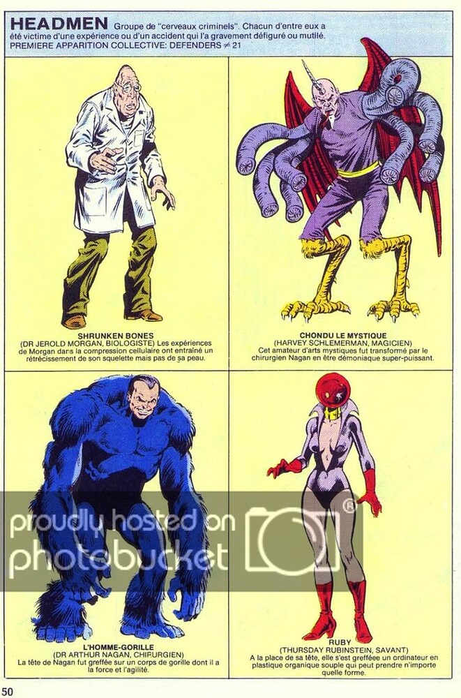 Steve Gerber en profite pour introduire un mystérieux et fort original groupe de vilains/savants fous, les Headmen, à savoir Arthur Nagan/Gorilla Man, Jerome Morgan/Shrunken Bones, Chondu The Mystic et Ruby Thursday. Personnages bizarroïdes par excellence (l’auteur de ces lignes se rappelle avoir fait connaissance avec eux, en se grattant le citron, dans les pages de Strange Special Origines, et ses fameuses fiches…), ce sont en fait des concepts Marvel pré-Fantastic Four 1 exhumés par l’auteur (sauf Ruby, une création originale quant à elle), précédant les super-héros d’une bonne dizaine d’années, comme Gerber le souligne en quelque occasion.