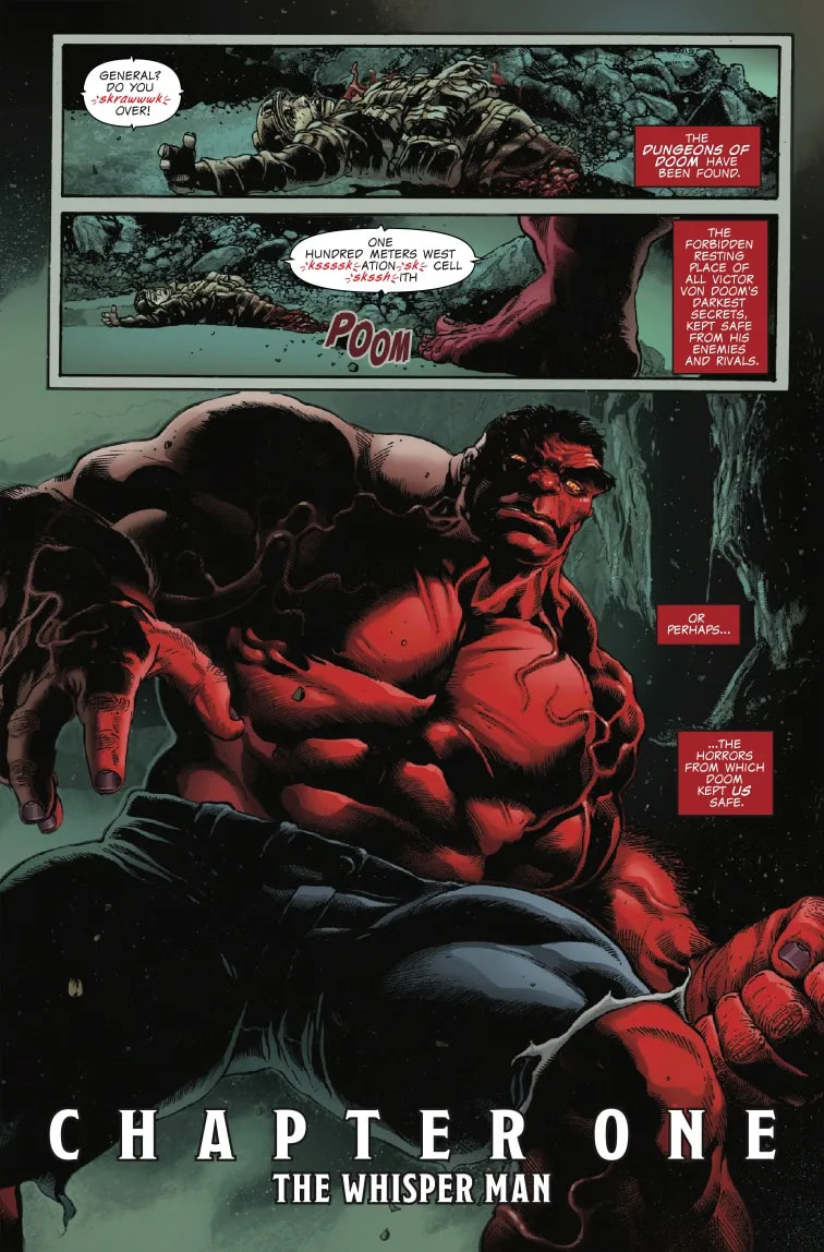 Bourrin mais bien. Phillip Kennedy Johnson & Benjamin Percy livrent un scénario direct et brutal, divisé en quatre parties plutôt intéressantes. On voit ainsi plusieurs factions qui s’affrontent en Latvérie pour récupérer les possessions de Dr Doom et notamment son château. Le sol s’effondre et les Américains, les rebelles latvériens et des agents d’Hydra tombent dans diverses parties souterraines. Les Américains et Red Hulk (car Ross gère ça et s’est transformé) sont séparés, et les soldats découvrent un laboratoire où un message télépathique du Professeur X les invite à fuir, car l’endroit abrite « un Mutant si puissant qu’il n’aurait jamais dû naître ». Les rebelles latvériens, qui ont souffert à cause de Doom, fuient dans une matière liquide étrange après avoir vu un esprit et été attaqués par des monstres. Les agents d’Hydra découvrent un marteau qui murmure à l’un d’eux qu’il est « digne ». Et un agent wakandais mystérieux, Umbra, arrive seul pour aller découvrir une entité chauve-souris étrange.