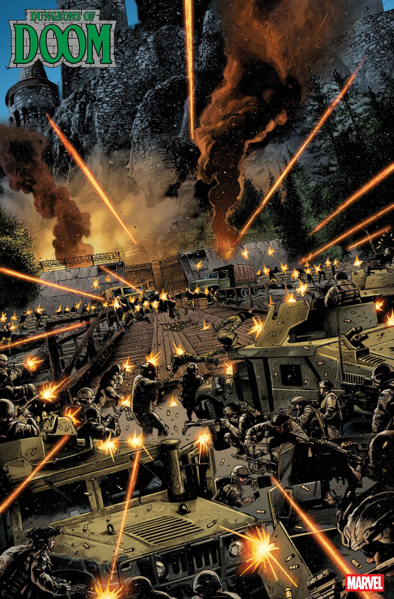 With Doom’s castle empty and masterless, the superpowers of the world race to claim and control the untold power and technology that await inside. But when an explosion sends them all plummeting into a dungeon labyrinth that none of them knew was there, what began as an arms race becomes a terrifying game of survival. Who, if any, will survive? And what horrors lie within the DUNGEONS OF DOOM?