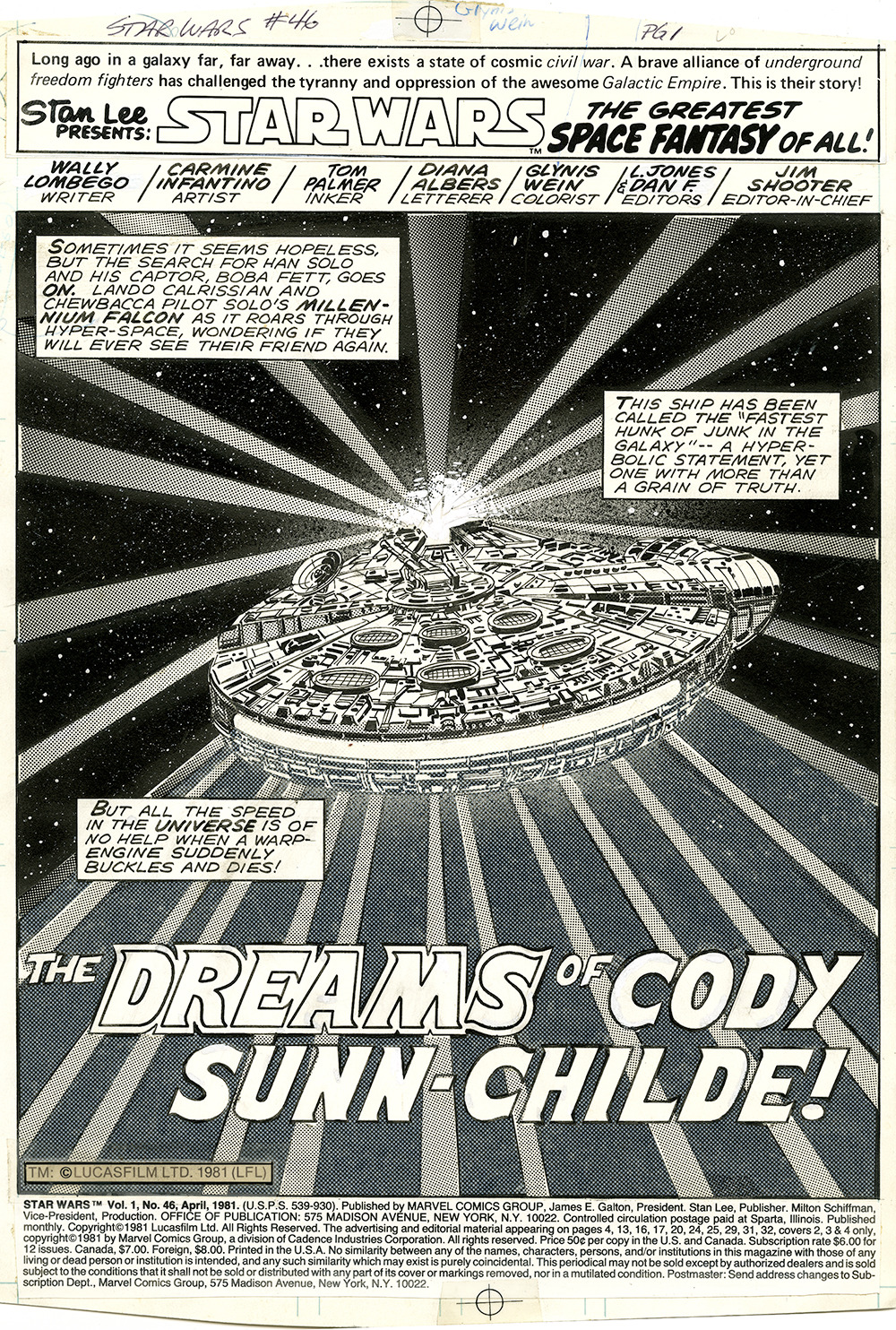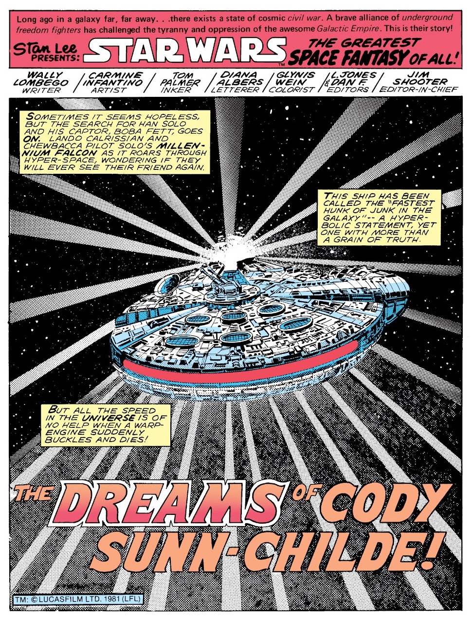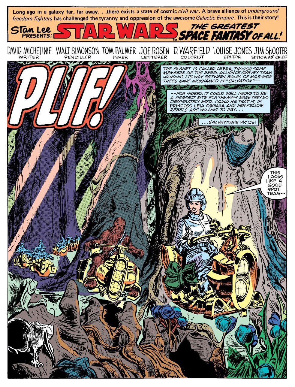 Ou encore cette page d’intro-là, avec des collages de trames visiblement bien casse-tête. Extrait de Star Wars #46, dessiné par Carmine Infantino.