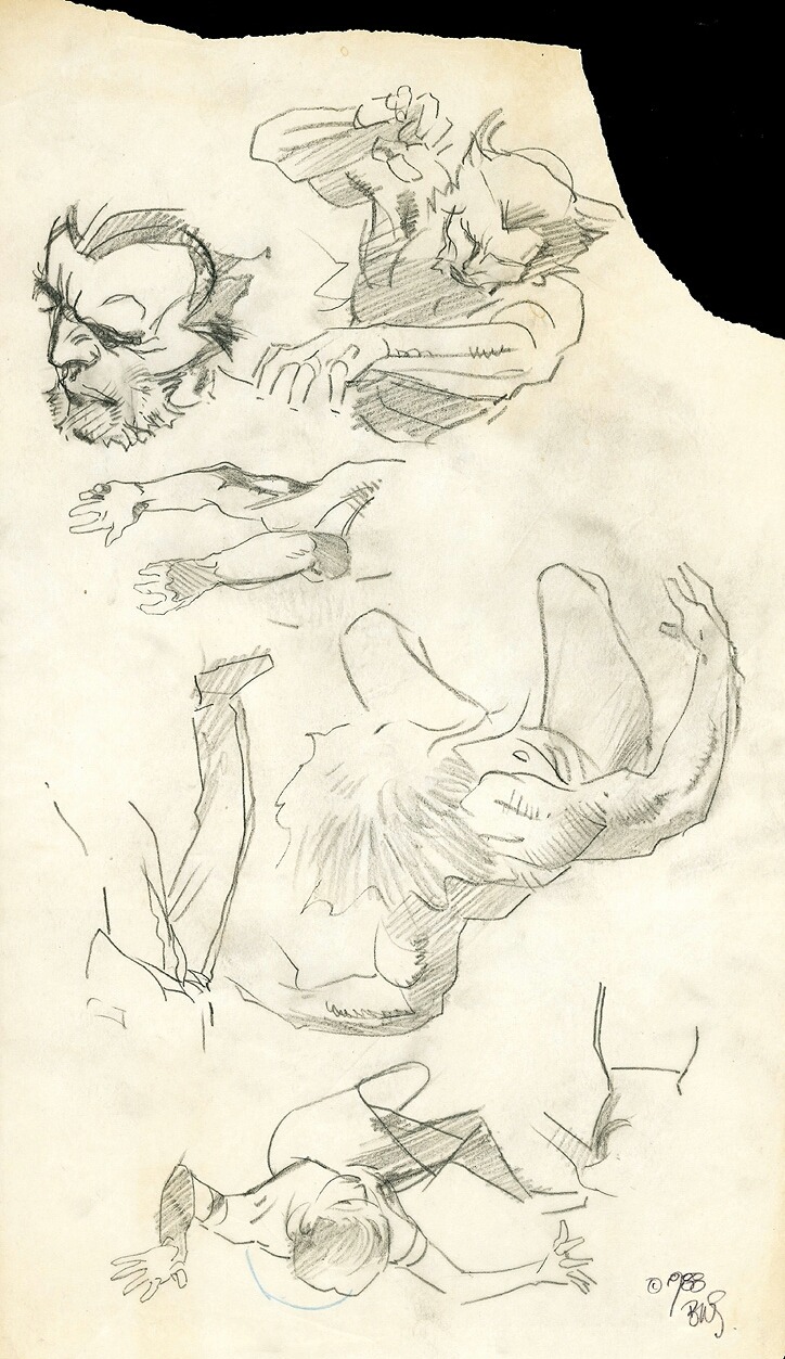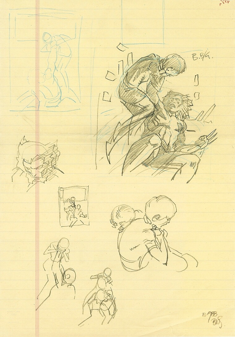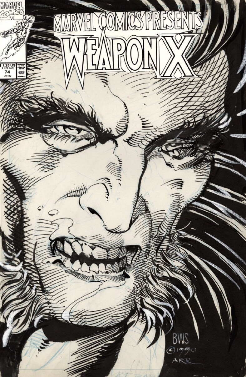 Barry Windsor-Smith drew the first image (with the big tear) during the concept and character design stages of Marvel Comics Presents: Weapon X. The second image (on the yellow legal paper) was specifically done for Chapter 4 of Weapon X. Chapter 4 was published in Marvel Comics Presents, Vol. 1 # 75.