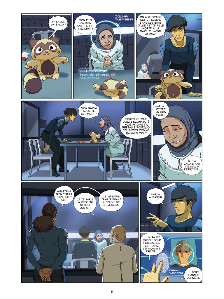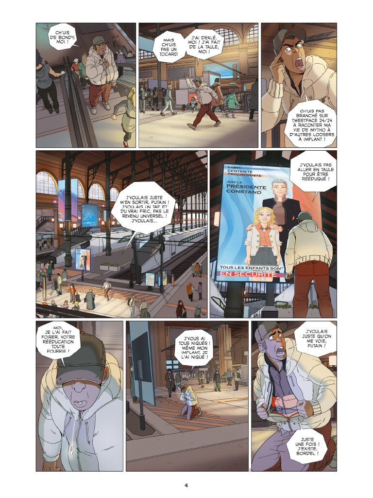 L’un des forces du récit repose justement dans les discussions entre personnages, qui expriment leurs inquiétudes malgré les informations que leurs implants leurs fournissent (tout le monde est fiché et les citoyens accèdent à de nombreuses informations rendant parfois caduques l’expression verbale). Ces implants suscitent des méfiances, et Valérie Mangin utilise cette « implantophobie » comme vecteur, faisant écho aux différentes « phobies » qui nous hantent dans le monde réel. C’est plutôt bien vu, et ça exploite un aspect de cette sorte de science-fiction qui est souvent oublié ou minoré, à savoir que tout le monde ne partage pas à égalité l’accès aux technologies (soit par manque de moyen soit, plus intéressant, par goût).