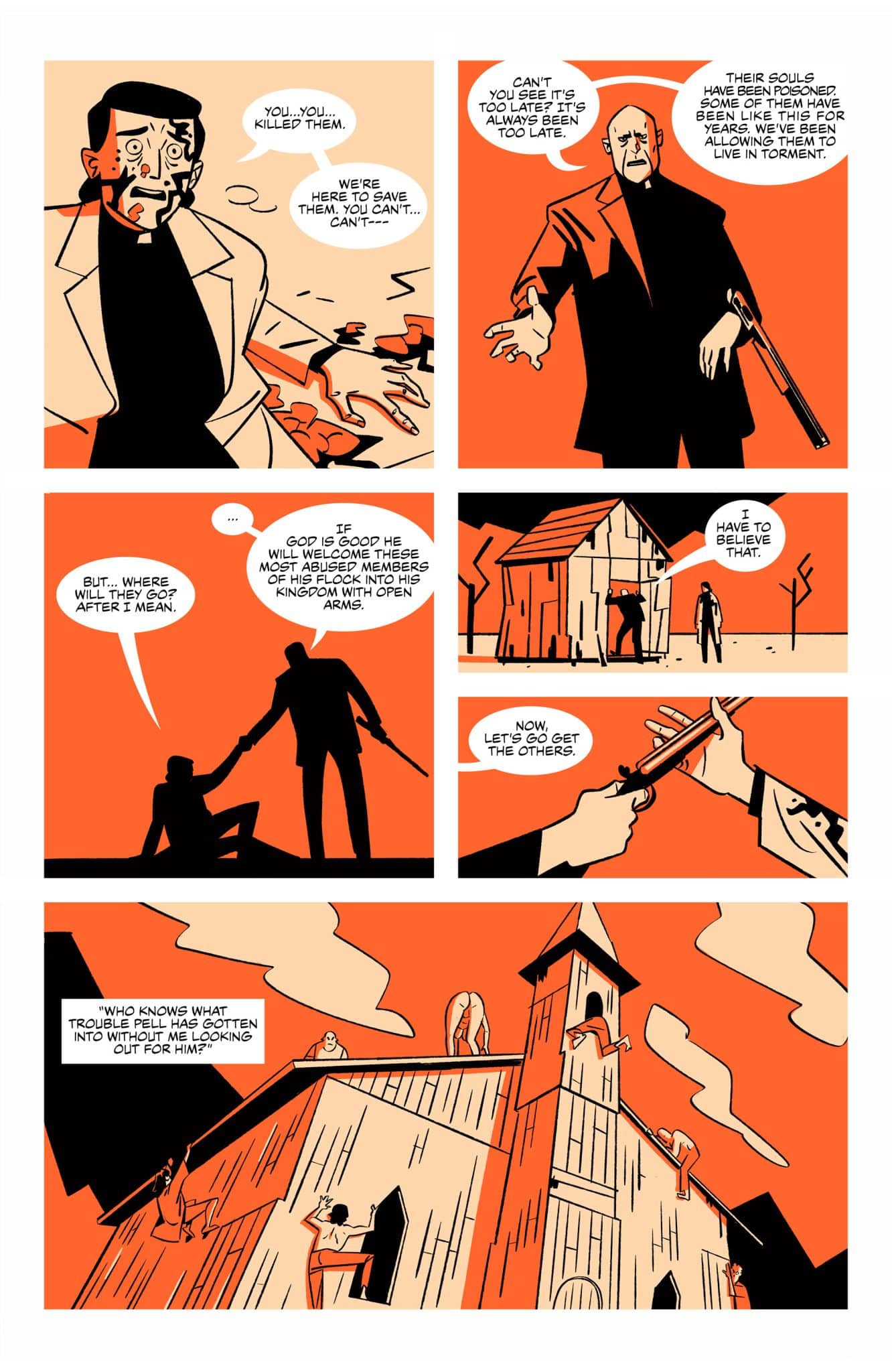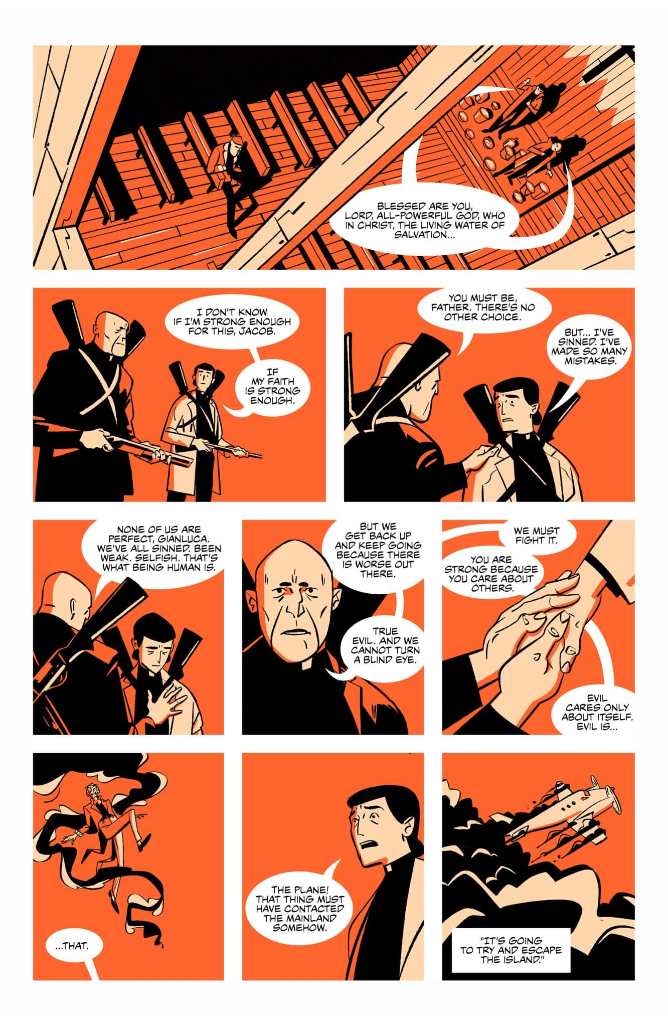 Art by Chris MatthewsThe priests begin to doubt the real motivations behind the island’s existence as we learn some of the historic emotional damage they have suffered before their arrival.