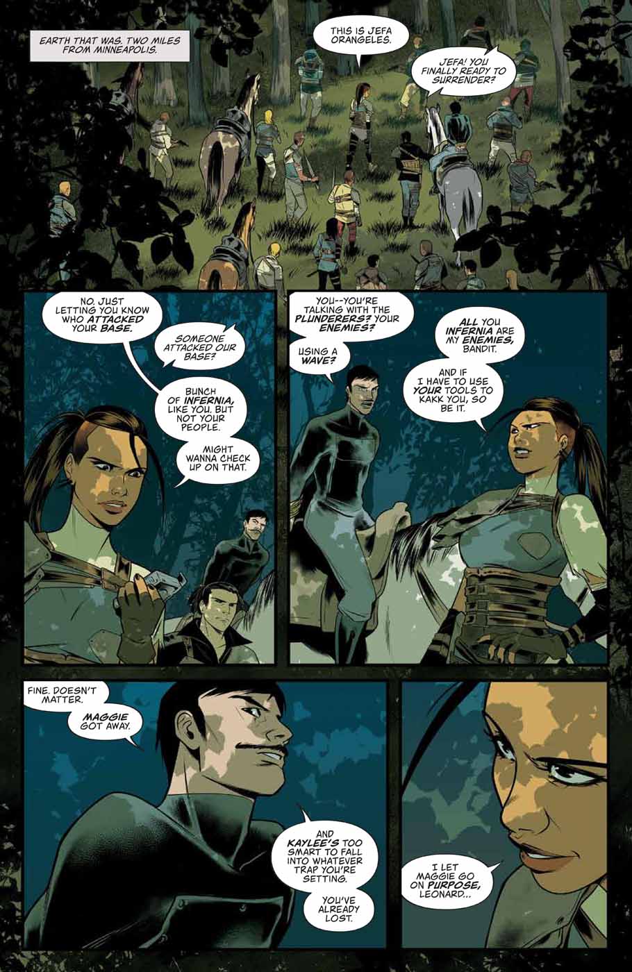 Description: What happens when your worst enemy becomes your only ally? With her sights set on freeing Leonard, Kaylee’s team chases the Jefa across the Earth That Was only to be led directly into a trap. But everything changes when they get attacked by plunderer robos who have been tracking both groups… to exterminate them all. Now, Kaylee must team up with the Jefa in order to fend off the robos. But if they survive this, how will they survive each other?