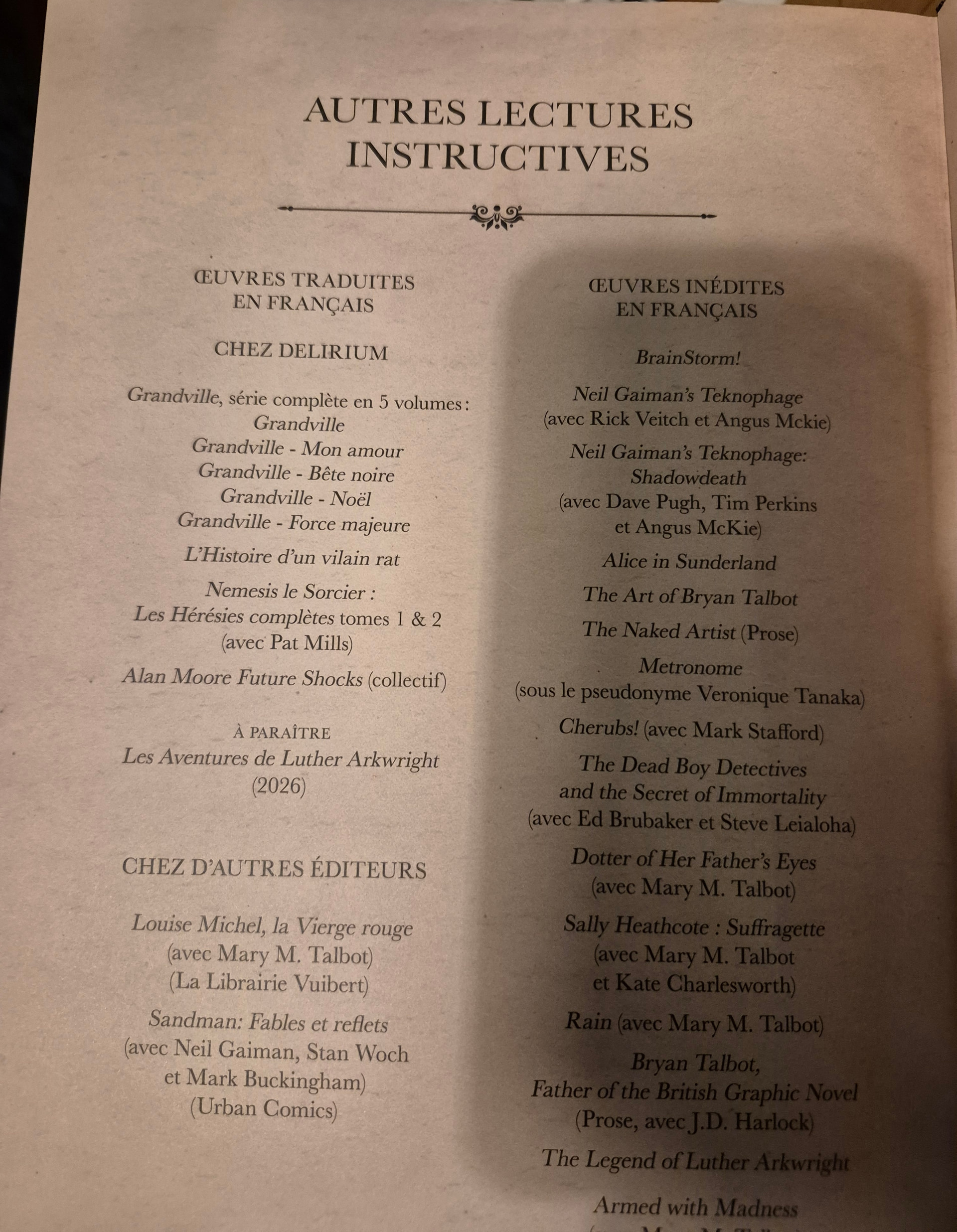 Si tu fais référence à The legend of Luther Arkwright listé dans les inédits en français ci-dessus, il s’agit sûrement de la séquelle récente sur laquelle Talbot a travaillé avant Les carnets de Stamford Hawksmoor. Tout de même, c’est assez incroyable de voir un auteur de ce calibre encore en pleine possession de ses moyens à 75 ans, qui continue d’explorer inlassablement et de faire ce qu’il a envie.