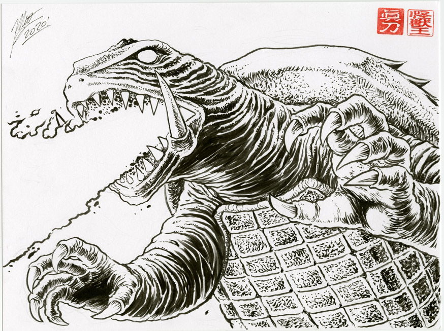 Le succès de King Kong contre Godzilla en 1962 a également poussé la Daiei à se mettre aux films de monstres, même si la société n’avait pas encore les structures nécessaires pour les effets spéciaux requis pour les kaiju eiga. Pendant deux ans, le projet est passé par plusieurs stades…une pieuvre géante, des hordes de rats qui déferlent sur Tokyo…avant de s’arrêter sur une tortue géante, une idée du président du studio (mais sur ce point les témoignages divergent).