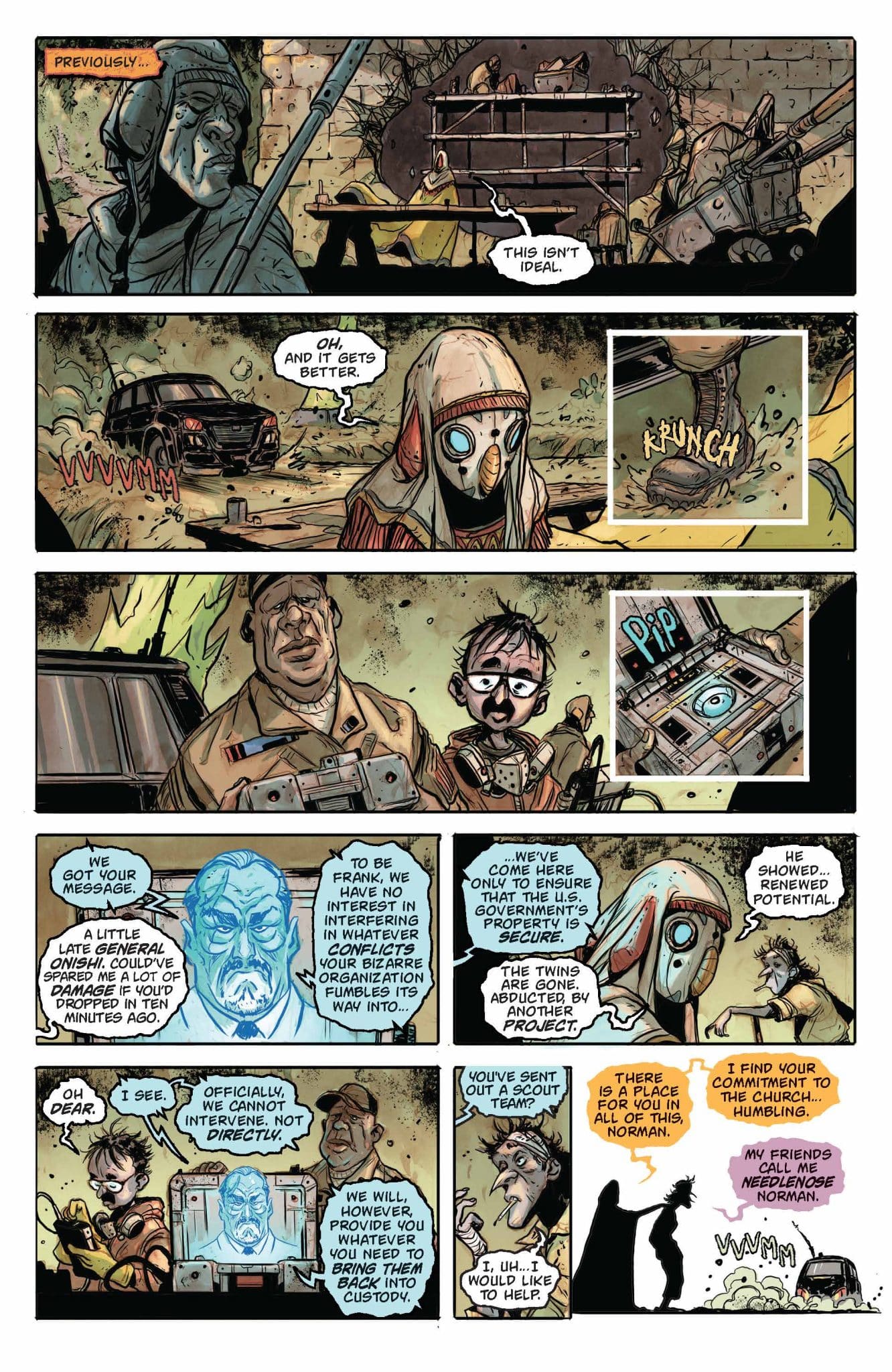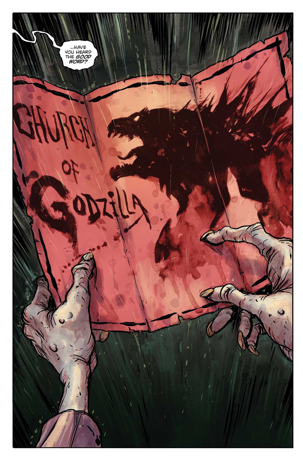 In this issue… Godzilla vs. the Wanderer! The return of the Church of Godzilla! Possibly even hints at the mysterious origins of our mysterious heroes?! Find out in the first-arc finale of Godzilla: Escape the Deadzone!