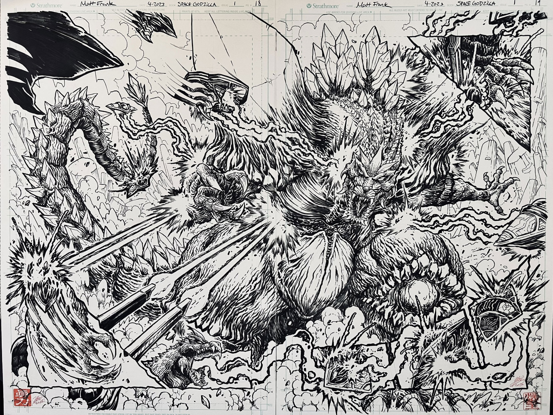 Recyclage d’une idée non utilisée dans les années 70, SpaceGodzilla (son arrivée est annoncée par les petites fées gardiennes de Mothra) est un massif kaiju bien pataud qui utilise des constructions cristallines dont son corps est en partie composé pour diriger son énergie et s’en servir comme rayon mortel. Lorsqu’il les installe en pleine ville avant le combat final, le visuel est plutôt accrocheur (en me rappelant les monolithes de La Cité Pétrifiée, une série B des fifties) et permet de varier les situations et les coups portés lors de l’affrontement comme il se doit (très) musclé entre Godzilla et son double spatial.