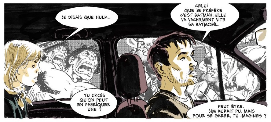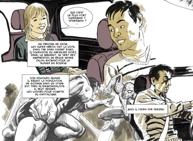 Dedans, il y a des scènes où le personnage parle de comics avec son fils et réfléchit aux rapports entre héros, politique, capitalisme… et c’est émaillé de citations visuelles directes issus de comics comme Superman vs Spider-Man (celui d’Andru) ou Dark Knight de Miller.