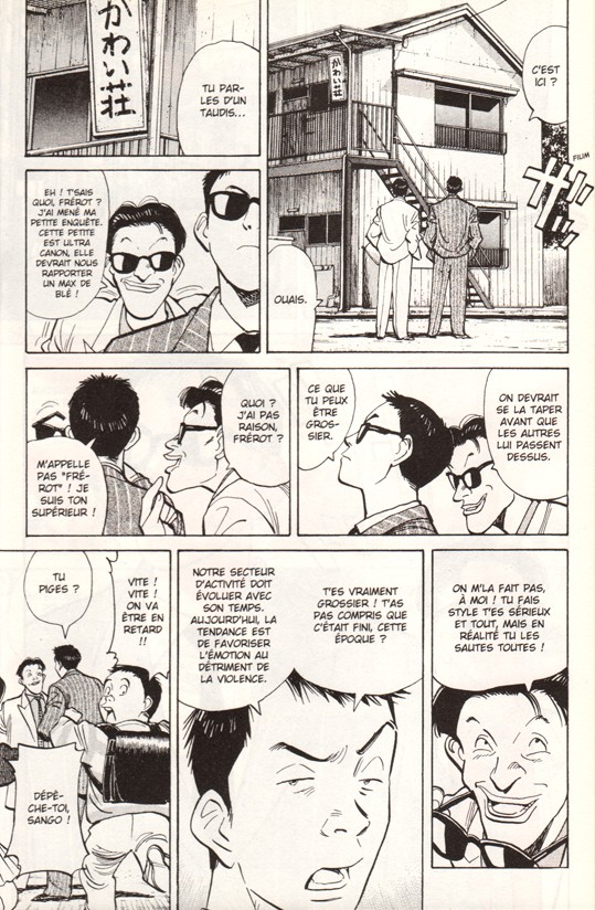 L’autre truc très sympa dans la série, c’est que cette dimension de comédie permet à Urasawa de dessiner de nombreux personnages qui sourient, qui grimacent, qui expriment des émotions extrêmes, ce qui tranche avec certaines séries qui ont fait sa célébrité, où poursuivants et poursuivis affichent des faciès impassibles (Tenma ou Runge dans Monster, genre). Et comme Urasawa est un caricaturiste de première, c’est très vivant, une dimension que j’apprécie aussi dans Asadora.