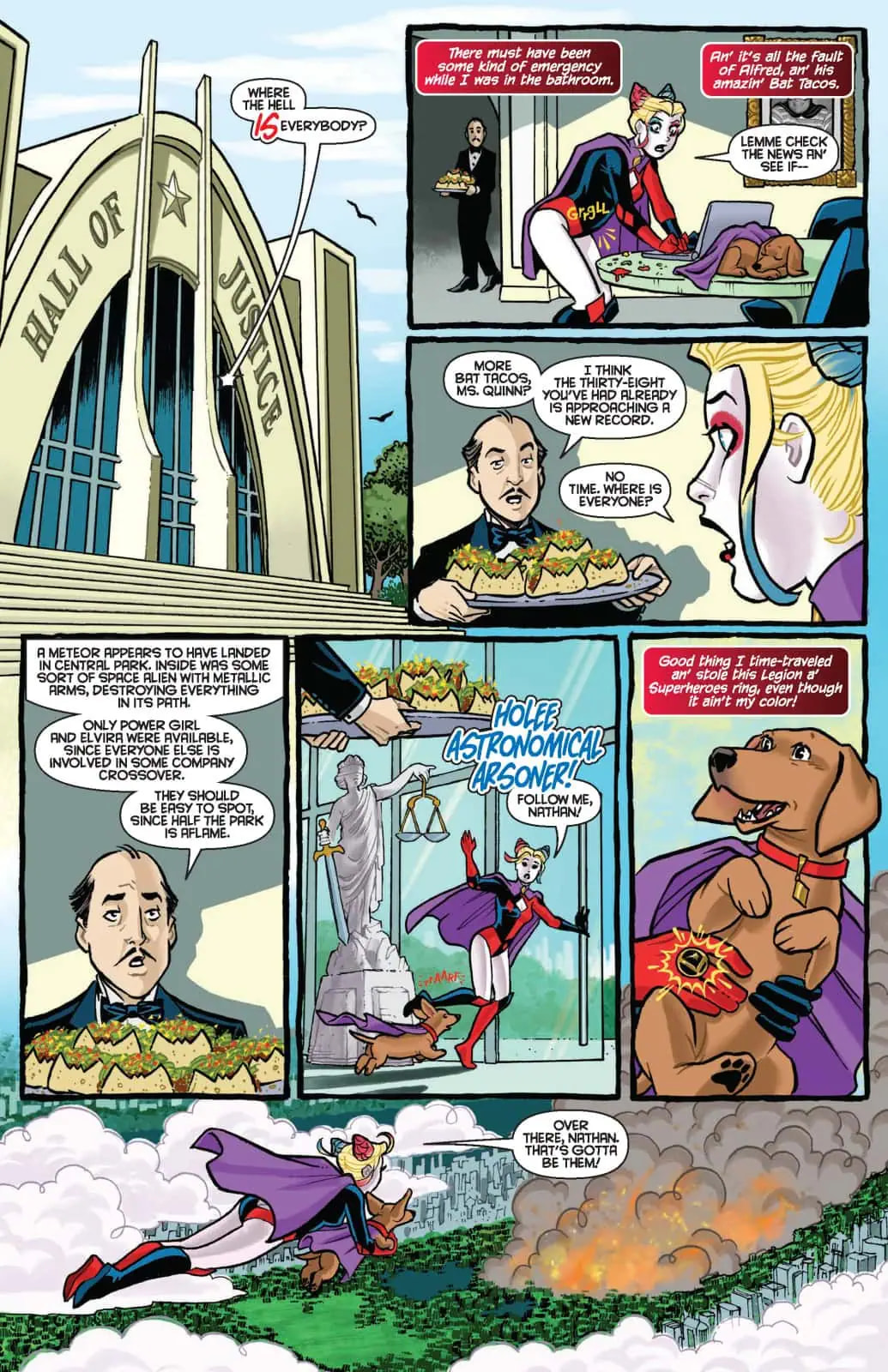 NEXT STOP: TRANSYLVANIA! Harley Quinn’s plan to throw a borough-wide Halloween party in Brooklyn to save Elvira’s cancelled TV show is shaping up nicely — and by “nicely,” of course we mean “total chaos!” Facing a distinct lack of legitimate investors on this side of the Atlantic, Harley and her reluctant partner in crime have to broaden their appeals. That means courting Old World money — and money doesn’t get much older than the mouldering family fortunes found in certain European crypts!
