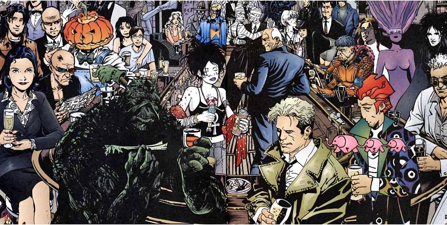 "Constantine croisera encore des personnages DC comme Doctor Fate ou le Spectre dans les pages du Books of Magics de Neil Gaiman, jolie série se voulant un panorama des bas-fonds mystico-magiques de l’univers DC, mais aucun super-héros n’apparaîtra jamais dans les 300 numéros de Hellblazer (Il faudra attendre les New 52 de 2012 pour que Constantine réintègre l’univers DC).