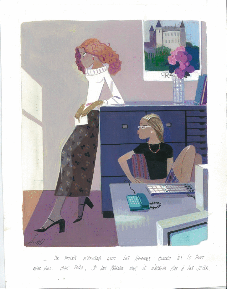 Ses Parisiennes sont des jeunes femmes toutes en jambes, qui ont des atermoiements amoureux superficielles, qui consacrent leur existence au farniente et au shopping. Il y a un travail de la forme et des couleurs qui renvoie à la publicité et au dessin animé des années soixante, avec parfois des lumières incroyables. Une belle technique, un style mêlant caricature et design et une espèce de légèreté qui n’est pas désagréable en période de sinistrose. Même si, comme le souligne Ginevra, cet humour semble d’une autre époque.