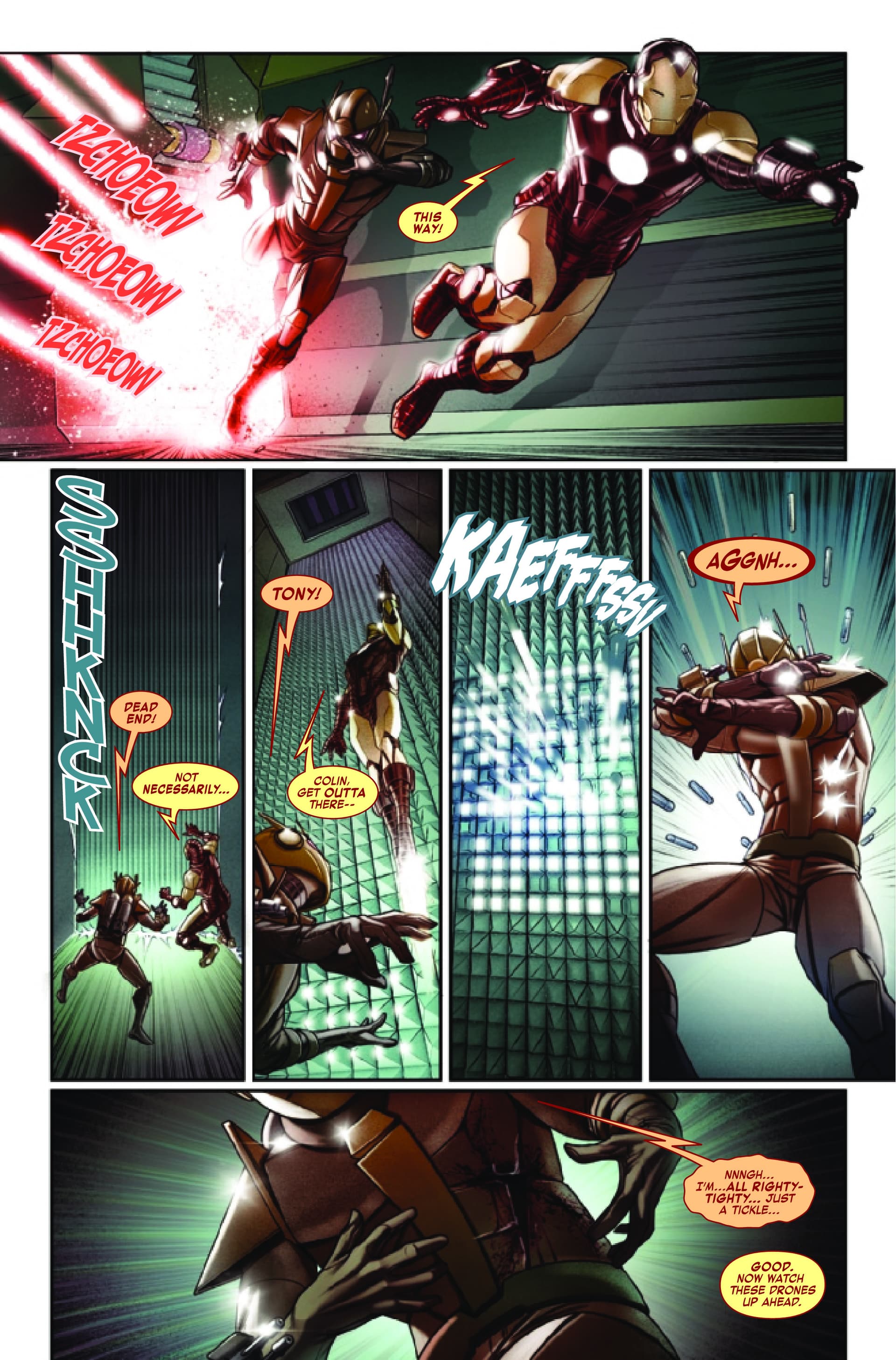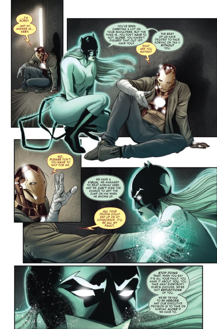 Christopher Cantwell maintient son approche originale, l’égocentrisme d’Iron Man par une dépression et l’accumulation de mauvaises décisions. Il continue ici, notamment en réunissant Scarlet Spider, Gargoyle, Frog-Man et Misty Knight, super-héros qui passent sous le radar pour agir contre Korvac. Surtout, Stark utilise Hellcat comme appât, et ça se passe très mal car Patsy retombe dans la folie qui l’a menée au pire, avec Hellstorm, à cause de Korvac. Ce dernier crispe Tony, qui se demande si Korvac, tellement intelligent, a vraiment « tort » de vouloir agir pour le « bien commun », mais Korvac fait apparemment sauter les alliés de Tony, et Iron Man se retrouve seul… alors que Korvac file vers Taa II.