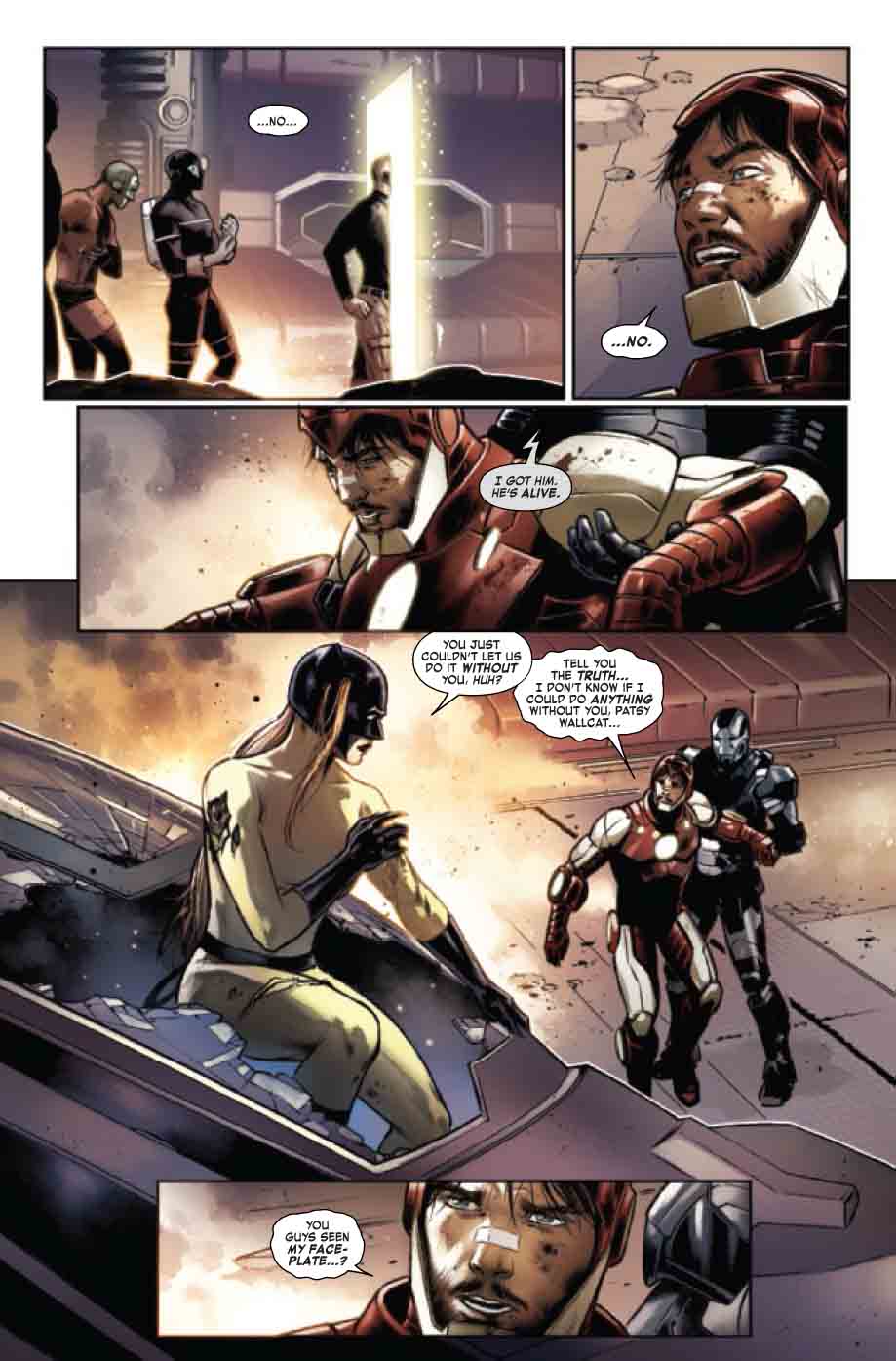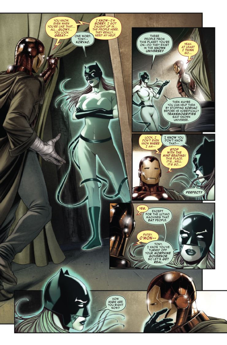 Christopher Cantwell continue sa saga étonnante, avec un Tony dépressif et égocentrique, qui erre pour essayer de lutter contre Korvac. Il est aidé par Hellcat, blessée au visage lors de l’épisode précédent, et a priori liée à Korvac, avec ses propres démons. Korvac se prend pour dieu et veut aspirer de toute la Terre pour aller sur Ta II, le vaisseau de Galactus. Un beau programme, que Tony veut empêcher en recrutant des alliés au profil inattendu, pour surprendre Korvac, qui réussit sa première étape.