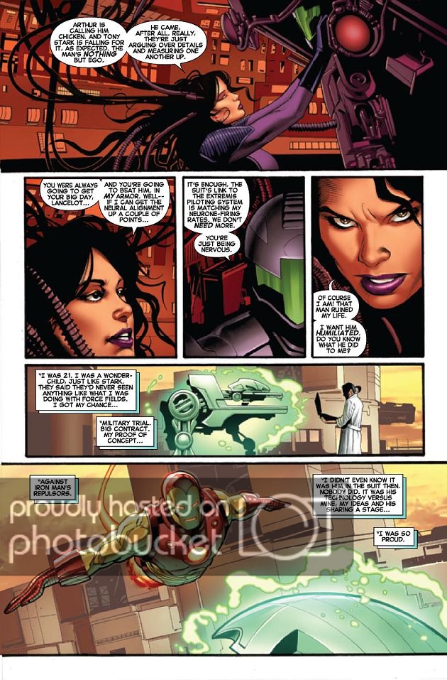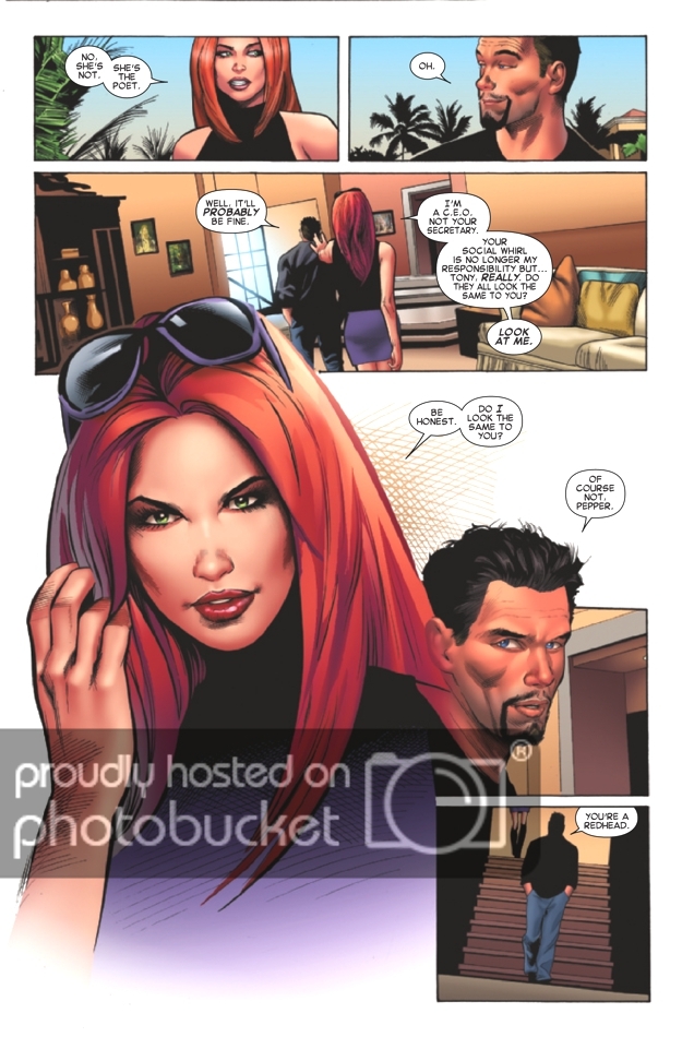 La case 4 renforce cet effet conversation en revenant sur Stark. Mais là où c’est fort, c’est qu’elle compose avec la case 5 une seule image. L’intercase permet de séparer les deux interlocuteurs, mais aussi les deux visages affichés sur les écrans, ce qui induit une distribution de l’information et une progression dans le raisonnement (et question lettrage, ça renforce le fait que Pepper est en train de comprendre, puisque ça isole sa bulle…). Très bel effet.