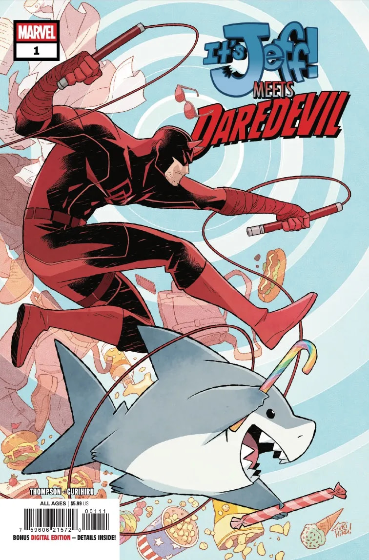 In this special new story from star Jeff team Kelly Thompson and Gurihiru, Jeff the Land Shark learns the meaning of courage from THE MAN WITHOUT FEAR! Plus, the latest season of IT’S JEFF appears in print for the very first time so you can enjoy all the adorableness and chaos the way Daredevil himself would — without a phone screen! Don’t miss what happens when Jeff wins the lottery, goes to the groomer, and best of all… TAKES ON THE HULK!