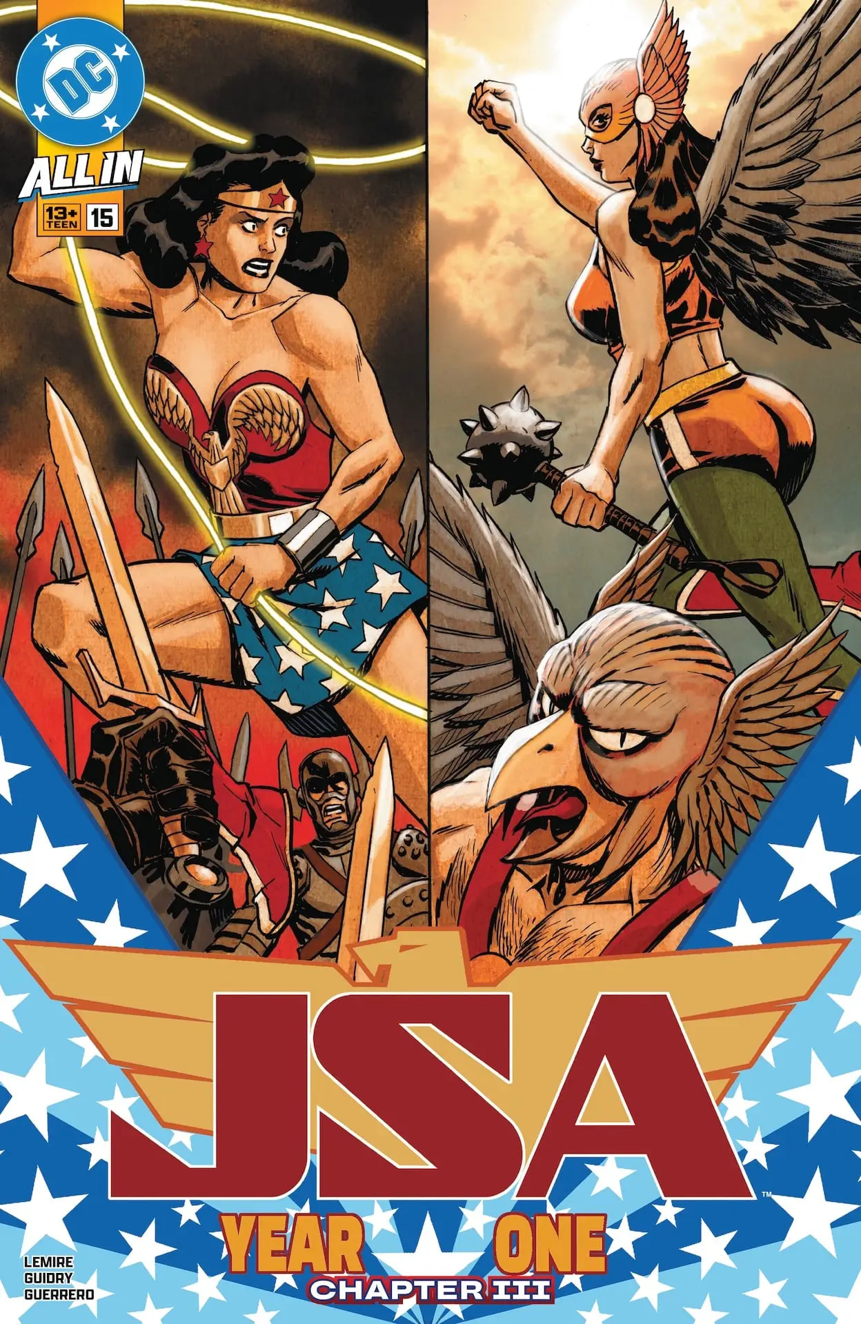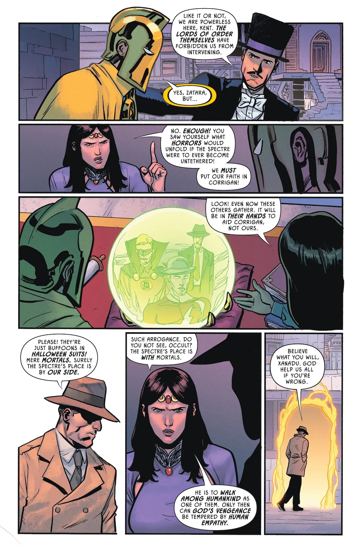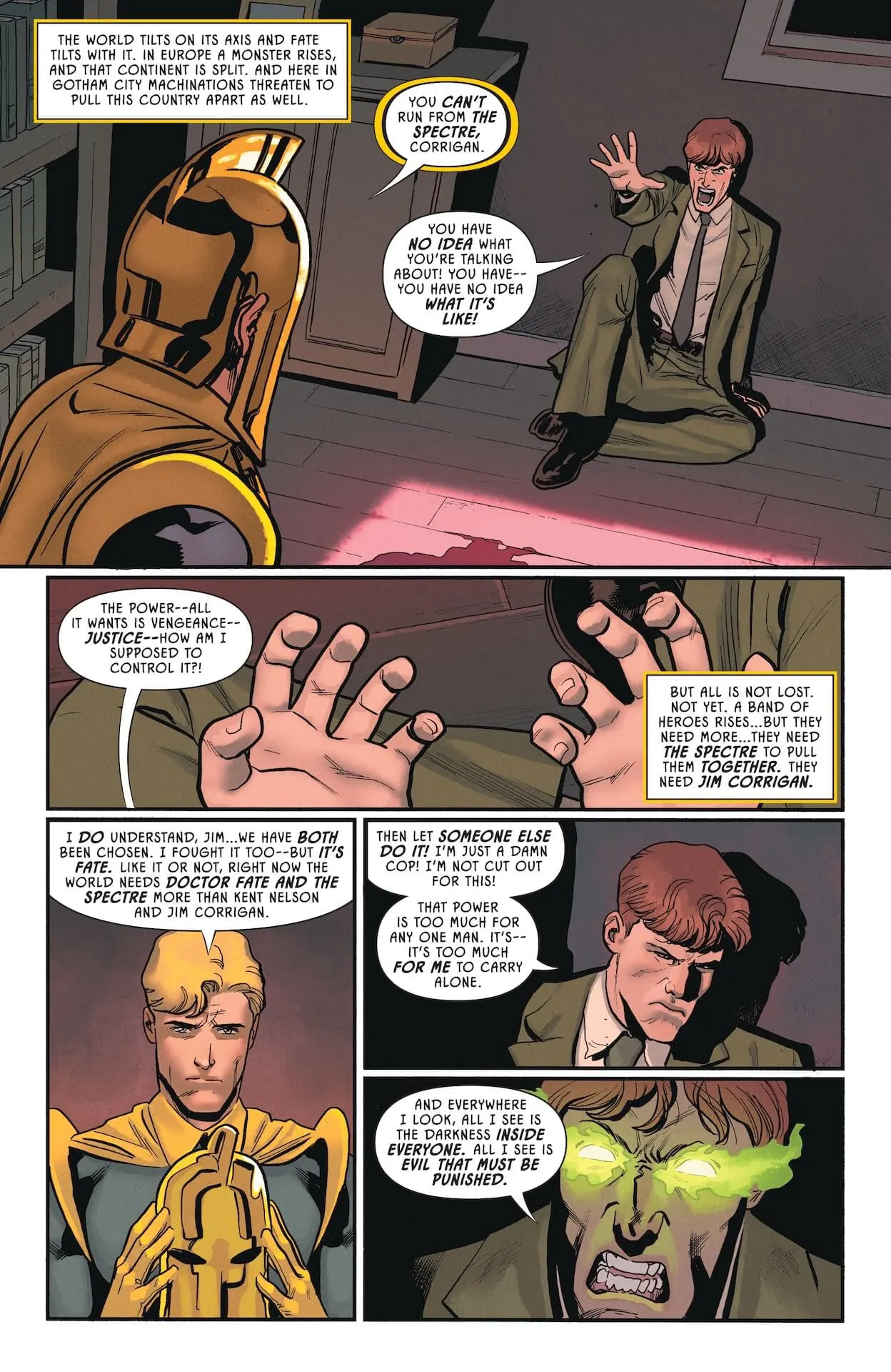Solide. Jeff Lemire continue tranquillement sa saga d’origine, avec le groupe de mystiques qui doute du choix de Jim Corrigan comme hôte du Spectre, et Mme Xanadu qui doute que Dr Fate se retiendra d’intervenir dans les événements. Hippolyta et Atom remontent une piste de sympathisants nazis, confrontent une super-vilaine et identifient Starco comme entreprise liée, alors que Alan Scott / Jay Garrick / Jim Corrigan sont aussi sur cette piste. Mais ils n’arrivent pas à s’entendre et se séparent, avec Jay qui rencontre ensuite Johnny Thunder qui lui montre définitivement son génie Thunderbolt. Et si Jim Corrigan a du mal à maîtriser le Spectre, Dr Fate intervient pour lui rappeler les conséquences que cela aurait sur le monde… alors que Hourman & Sandman sont vaincus chez Starco par une sorte de Starman, qui les enferment avec un homme en métal (Commander Steel ?).
