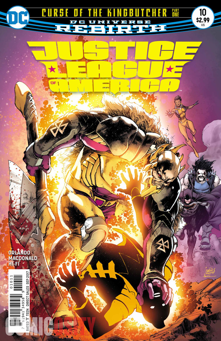 “CURSE OF THE KINGBUTCHER” part two! The JLA face off against the Lord of Order called Kingbutcher! In a battle that forces Ray Terrill to confront his own dark past in full view of his new teammates, the heroes struggle with the question of returning reality to its proper state or allowing the people of Vanity — including Ray’s estranged mother — to fulfill their fondest desires.