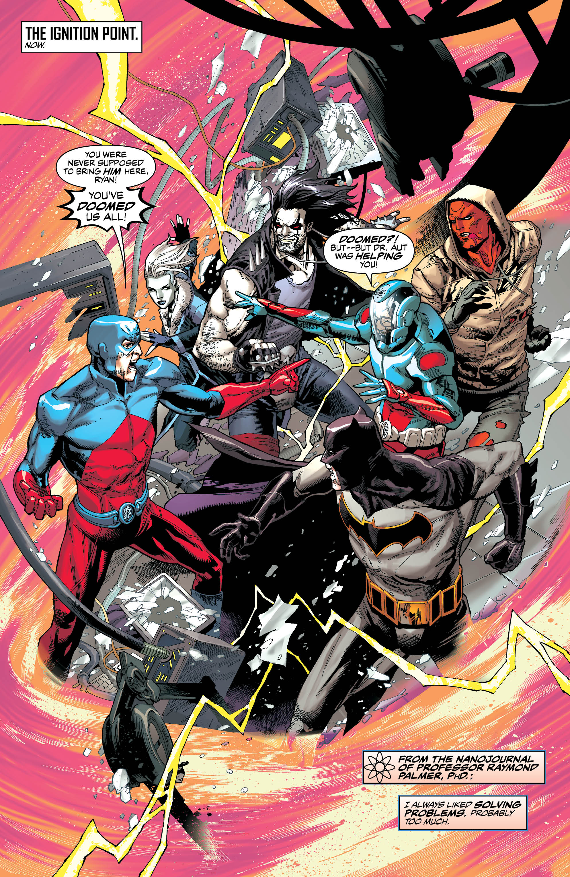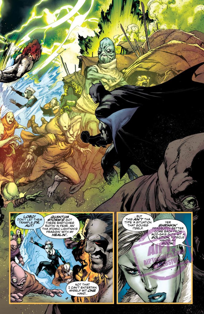 Ici, après une légère parenthèse avec Vixen, on retourne donc dans le Microvers, où Ryan Choi, Lobo, Killer Frost et Batman tentent de retrouver Ray Palmer ; évidemment, cela finit par arriver, et on a même la révélation sur celui dont Palmer demandait de se méfier, sans réussir à l’identifier.