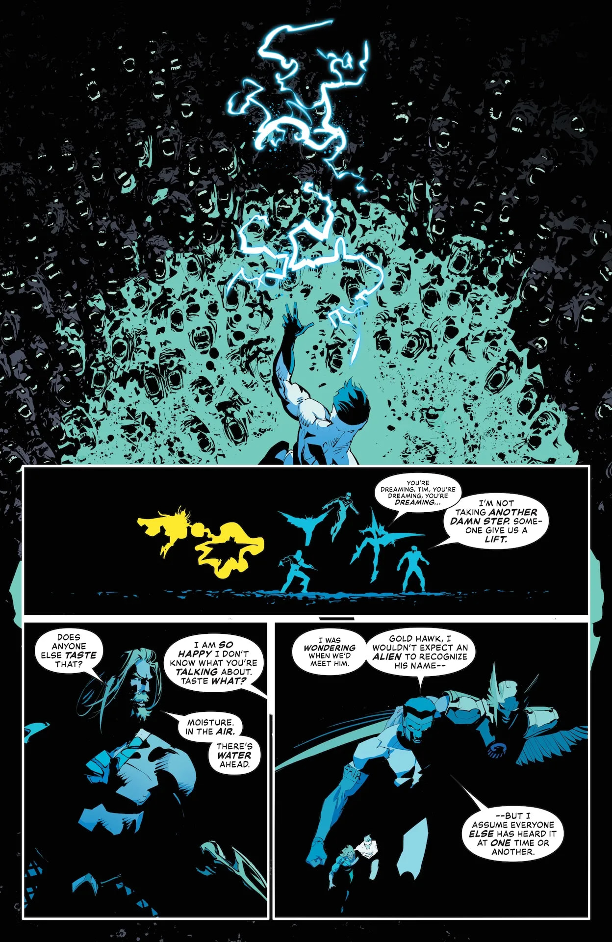 Efficace. Mark Waid continue de montrer les à-côtés de DC K.O., et les énièmes saloperies réalisées en douce durant une énième évacuation de la Terre. Ici, les membres restants de la JL perdent les communications avec les équipes, mais Blue Beetle comprend que cela vient du jeune Air Wave, qui a parasité les échanges en forçant le verrou temporel pour revenir de son voyage, vu dans un récent one-shot. Air Wave rétablit les communications et aide des super-héros secondaires à sauver d’autres face à des super-vilains boostés par Neron, et celui-ci leur propose un marché à distance. En Enfer, les membres restants des Terrific Ten s’évaporent, alors qu’un Superman à qui l’Espoir a été ôté se sacrifie face à un Démon, et Tim Drake en Batman Beyond meurt pour sauver Owlwoman, tandis que Gold Hawk est corrompu. Owlwoman et Dr Fate sont tuées au repaire de Neron, qui reçoit Mr Terrific. Michael propose de stopper les corruptions et attaques par Neron, et s’offre en échange : il serait son homme de l’intérieur, son sbire, son traître, mais… la place est déjà prise par Owlwoman, qui s’excuse et l’attaque dans le dos !