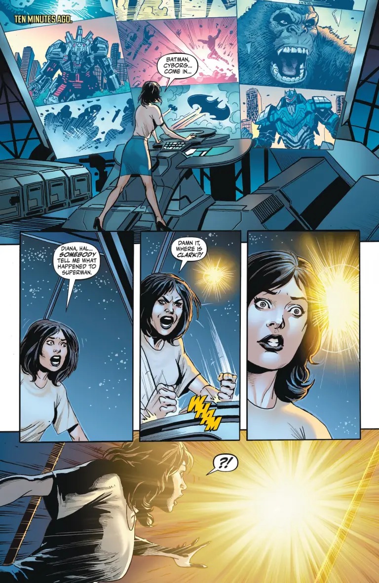 Un final sans surprise mais réussi. Brian Buccellato achève efficacement son récit, avec grosse bagarre générale entre Kaijus, Mechas et super-héros. Superman est ressuscité car Batman et Cyborg ont téléporté son corps près du soleil, ce qui l’a rechargé. Il attire Godzilla dans la bagarre, Beast Boy aide Kong, l’anneau de Guy rejoint Kong, Mechagodzilla est soumis, Toyman est retrouvé écrasé jadis par Godzilla. La menace est écartée, Superman a récupéré la Dreamstone (sous le pied de Godzilla…), renvoie les Kaijus chez eux après avoir eu confirmation que Lois accepte sa demande en mariage. Et ils fêtent ensuite via un pique-nique, dans les jours suivants…