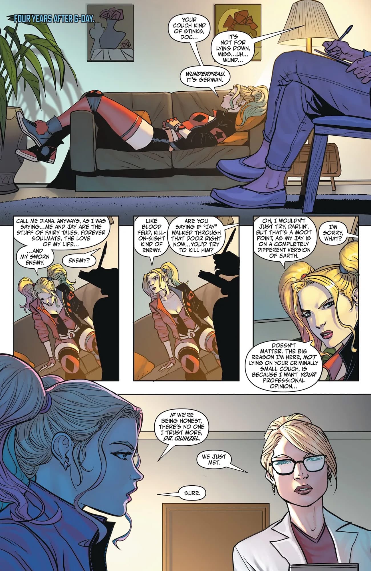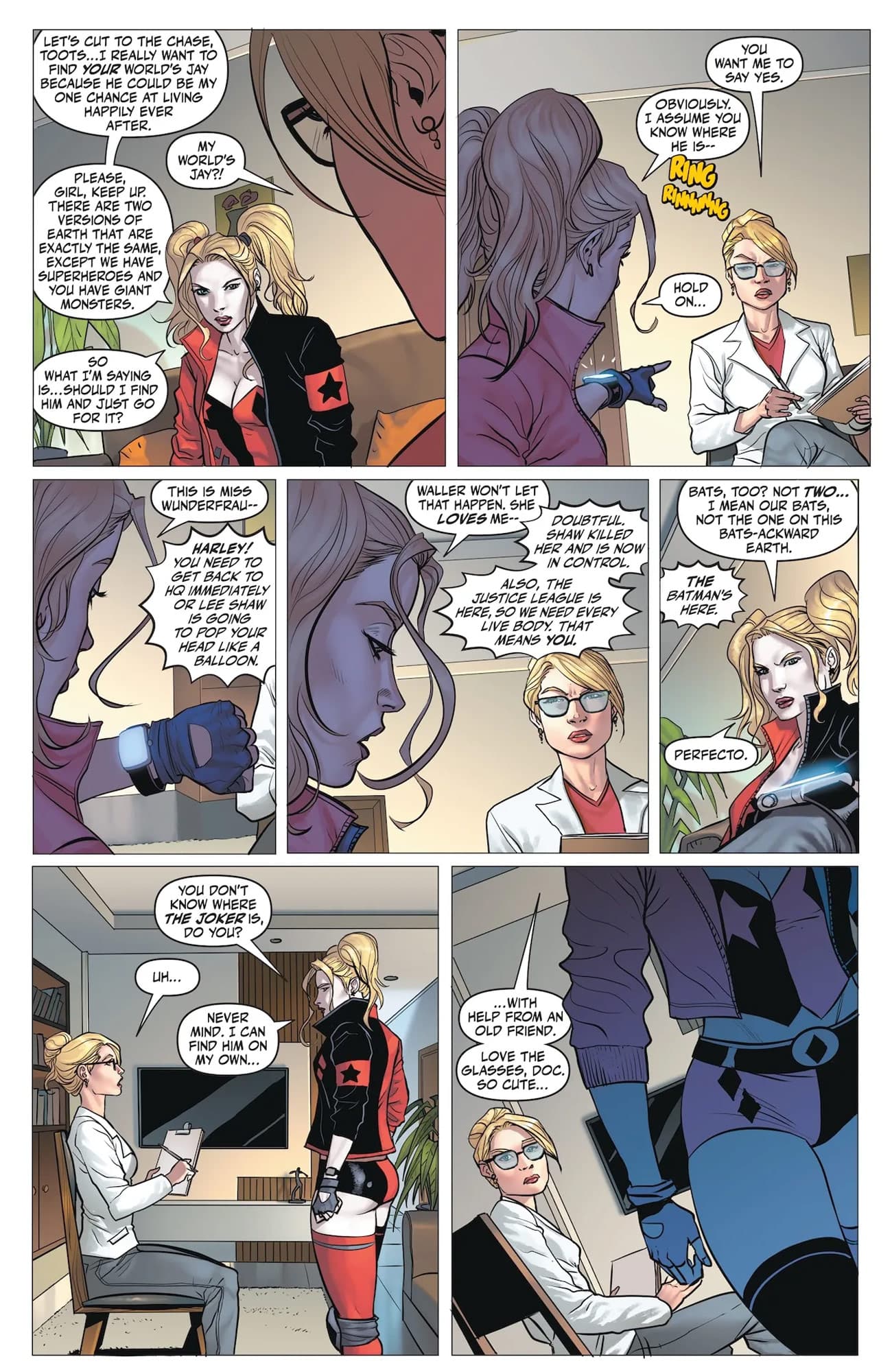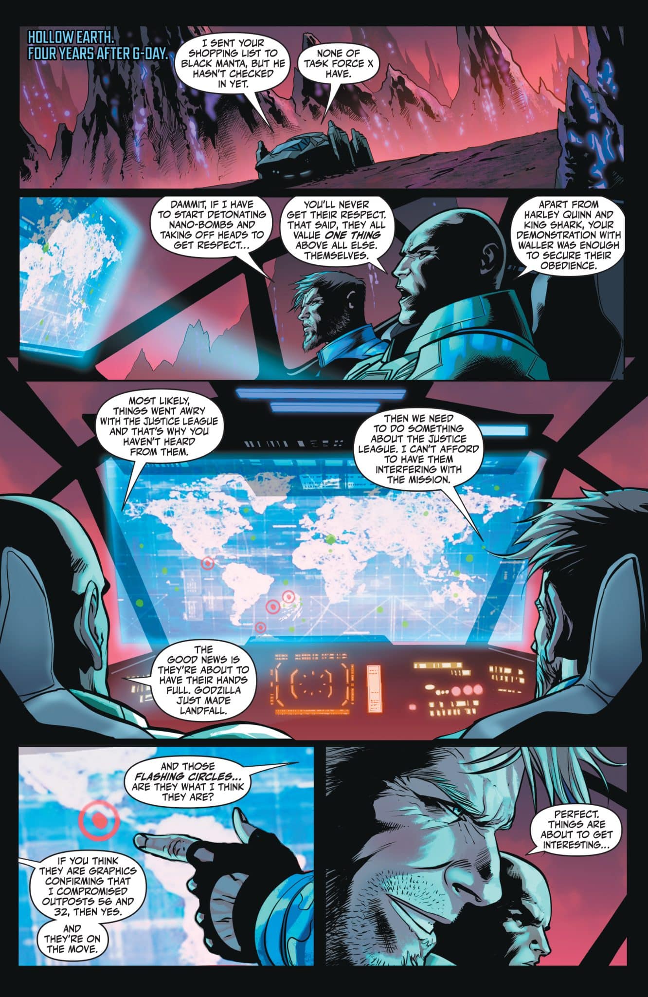 Ça avance tranquillement et efficacement. Brian Buccellato montre une Harley qui demande des conseils psychiatriques à la Harleen Quinzel de la Terre de Godzilla, puis revient à la base quand elle apprend que Lee Shaw a tué Amanda Waller. Celui-ci retrouve Lex Luthor après que ce dernier laisse Superman dans la Terre Creuse aux mains des grands singes. Lex trouve l’énergie des Titans et va poursuivre ses expériences. Diana se laisse prendre par la Suicide Squad pour trouver leur base mobile et s’en emparer avec Supergirl, alors que Flash convainc Batman de le laisser chercher son Mecha abandonné, pour appeler leur Terre à l’aide mais il est attaqué par la Legion of Doom puis Godzilla. Et Diana & Kara apprennent d’une agente de Monarch que Godzilla est attiré par les événements… et ce dernier débarque pile quand Superman sort de la Terre Creuse !