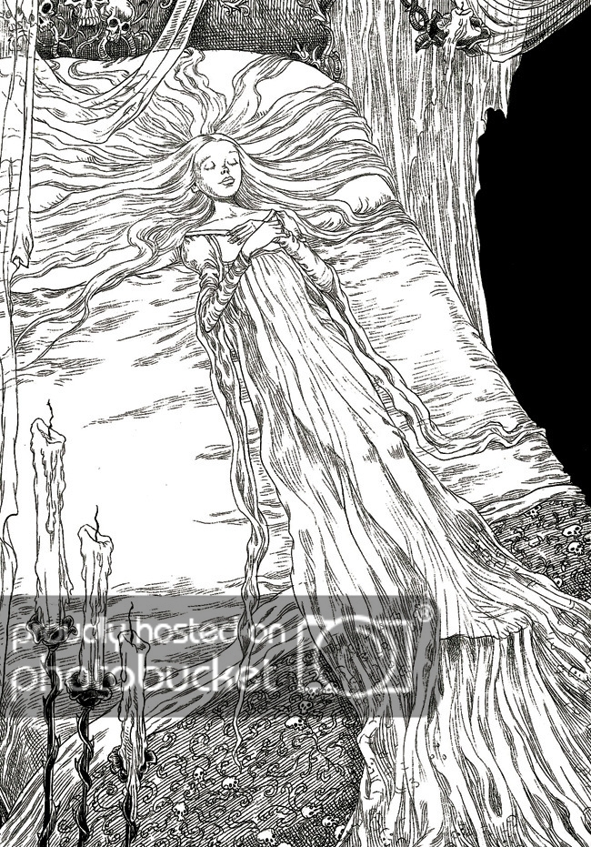 À la veille de son mariage, une jeune reine décide de quitter son palais pour aller délivrer une princesse prisonnière d’un sortilège de sommeil. Elle laisse sa robe de mariée, revêt sa cotte de maille, se pare de son épée et enfourche son cheval. Entourée des nains qui l’accompagnent et la protègent, la reine traverse un tunnel sous la montagne et avance vers le royaume endormi. Bientôt, un château apparaît dans le lointain. Ses murs sont recouverts de ronces et de toiles d’araignées et, dans le donjon, repose la princesse aux lèvres rouges comme les roses. Mais qui sait, peut-être que dans ce conte-là, la princesse n’est pas celle qu’on croit, et qu’une reine donnera un baiser à une belle endormie…