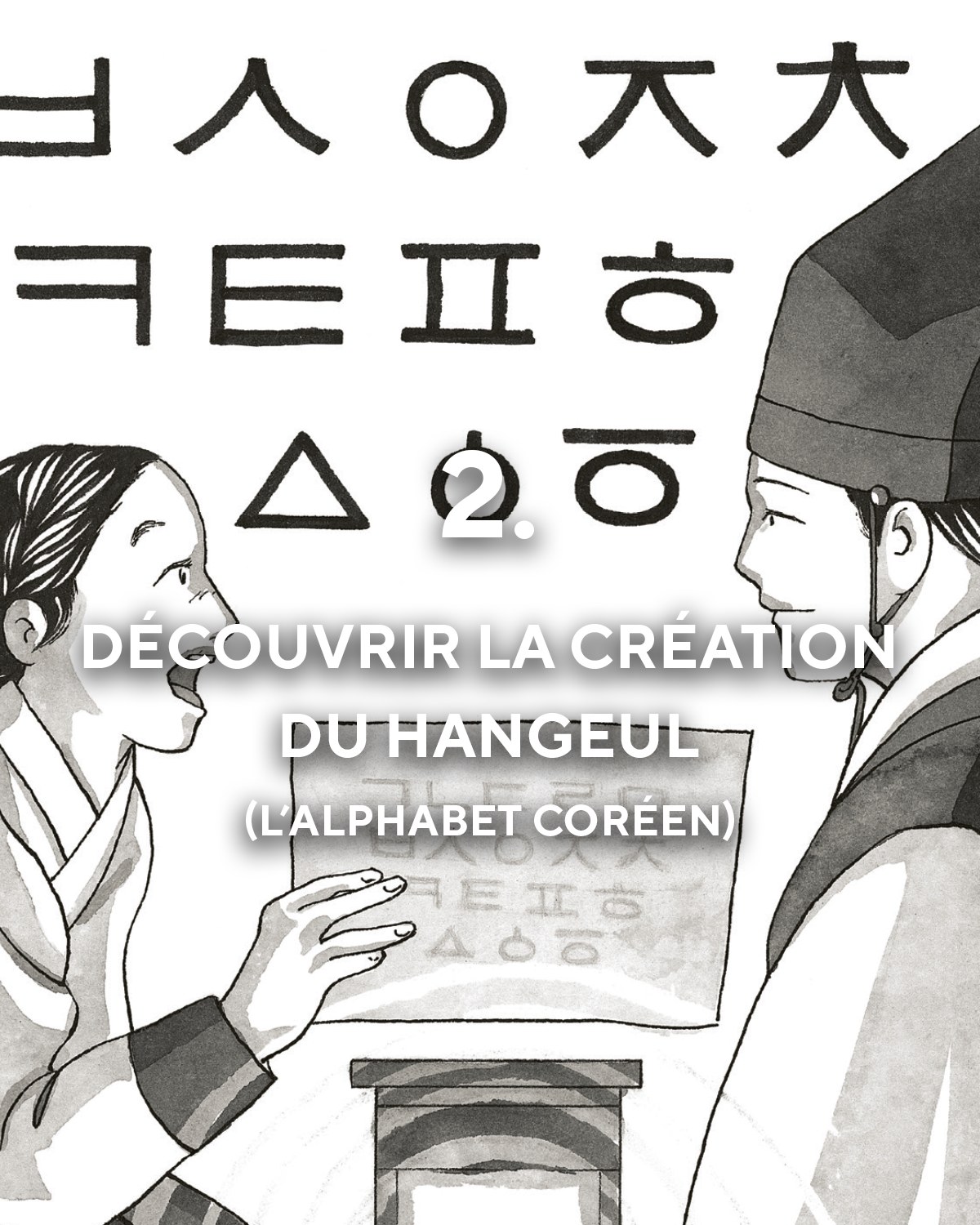 C’est le roi Sejong Le Grand qui demande à ses fonctionnaires de chercher “les hommes de savoir et de sophistication [du pays], qu’ils soient ou non noble de naissance, afin de les encourager à apprendre à lire au peuple, même aux femmes et aux filles”.