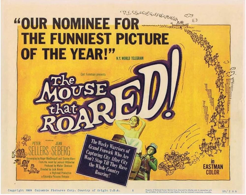 Avec sa croustillante « invasion » de l’Amérique par une petite troupe de soldats en armures d’opérette venus d’un trou perdu de l’Europe, La Souris qui rugissait déroule une satire aussi absurde qu’amusante qui ridiculise les grandes puissances souvent prêtes à jouer avec des forces qui les dépassent (il n’est pas étonnant que la bombe Q, théoriquement plus puissante que la bombe H, source de pression entre les U.S.A. et le Grand Fenwick, ait la forme d’un ballon de football, ce qui aura son utilité lors de l’enchaînement de gags du dernier acte).