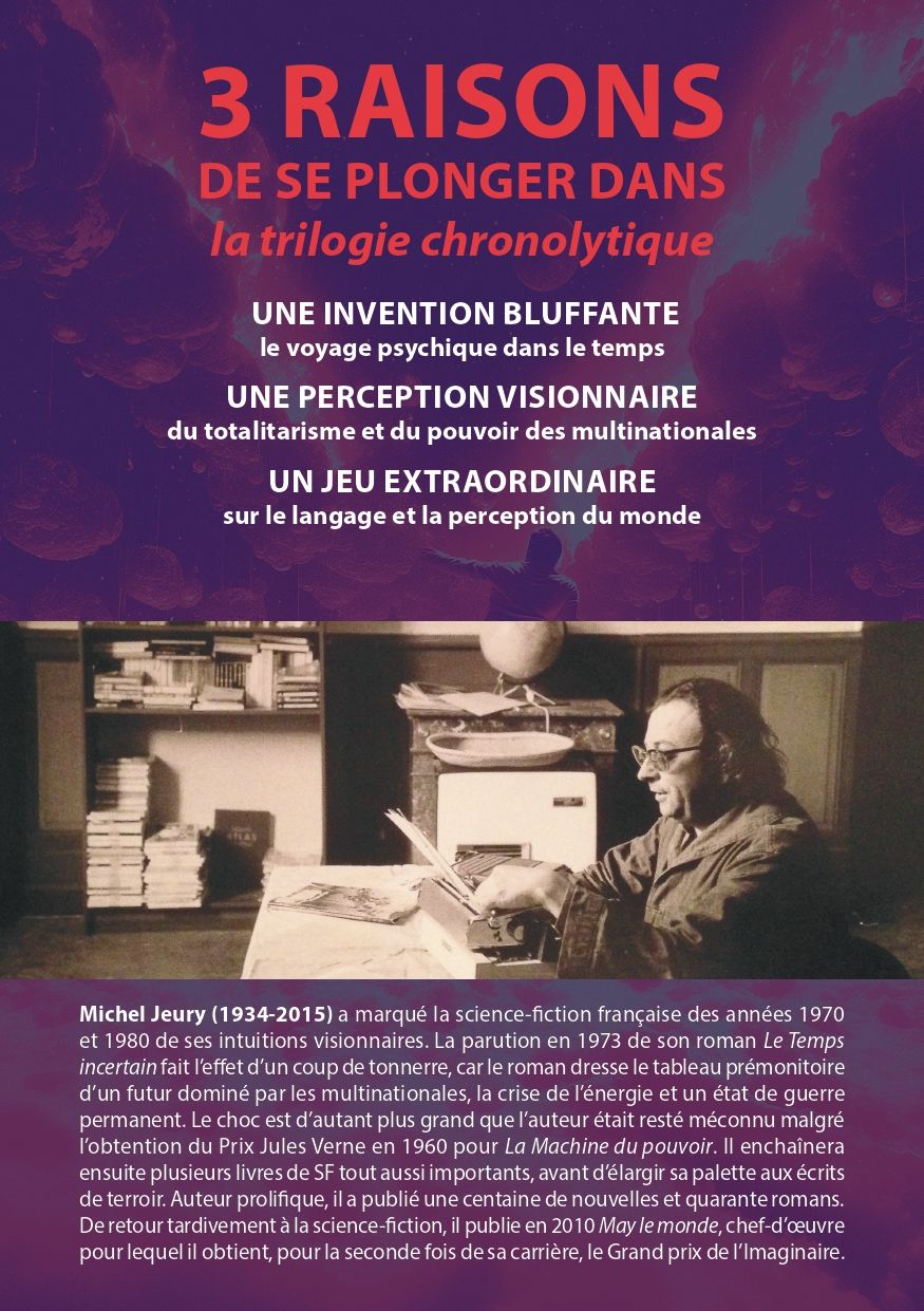 Valoriser l’oeuvre d’un écrivain c’est aussi favoriser la réédition de ses plus grands romans pour les actualiser. Je suis vraiment très heureuse que le Temps incertain de Michel Jeury puisse retrouver toute sa place dans la catalogue de la mythique collection « Ailleurs&Demain », fondé par Gérard Klein en 1969 aux Éditions Robert Laffont avec le paratexte de Joëlle Wintrebert et de Gérard Klein. Critique des hypersystèmes informatiques, menace de dictatures menées par des autocrates multimilliardaires, La trilogie chronolytique résonne étrangement avec notre présent chaotique…