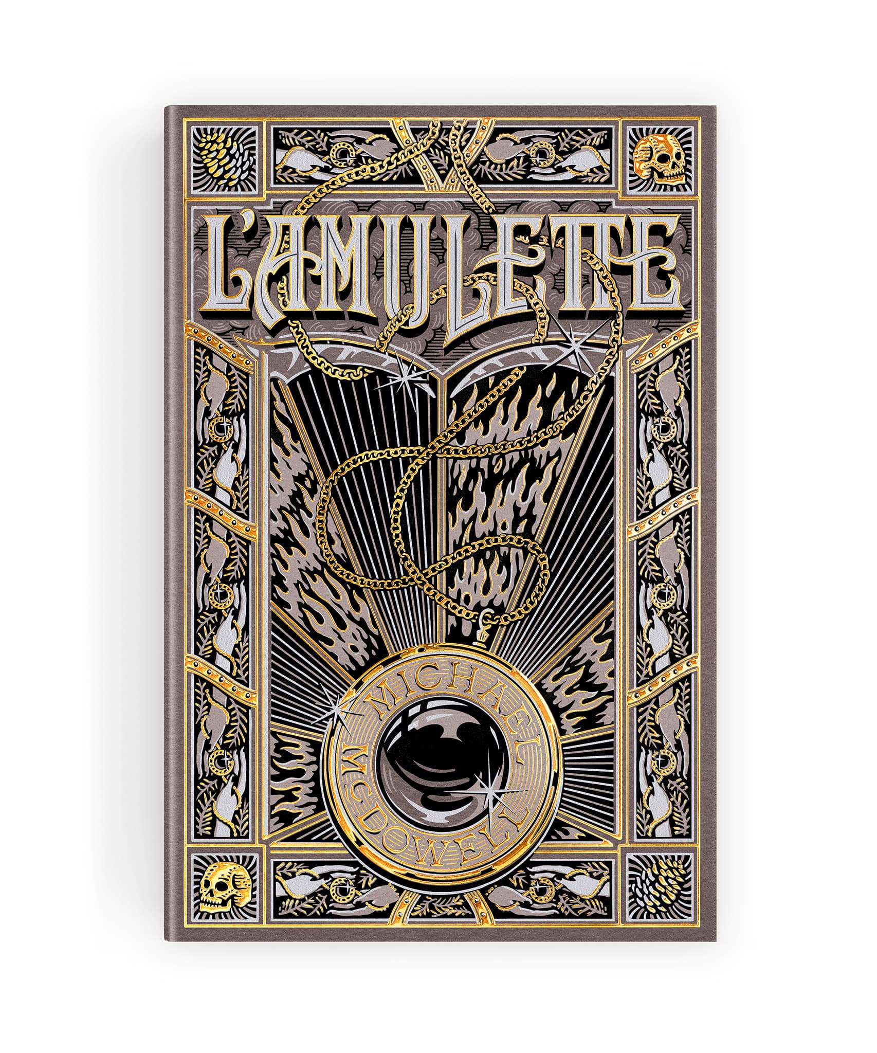 L’Amulette, de Michael McDowell. Traduction de l’anglais (États-Unis) par Laurent Vannini. Illustration de Pedro Oyarbide. Couverture fabriquée par l’imprimerie Print System, à Bègles. Impression du bloc intérieur et façonnage par Firmin Didot, à Mesnil sur l’Estrée. Format 10,8:x:16,5:cm. Broché. 442 pages. Titre original : The Amulet. Date de parution : 31 octobre 2025.
