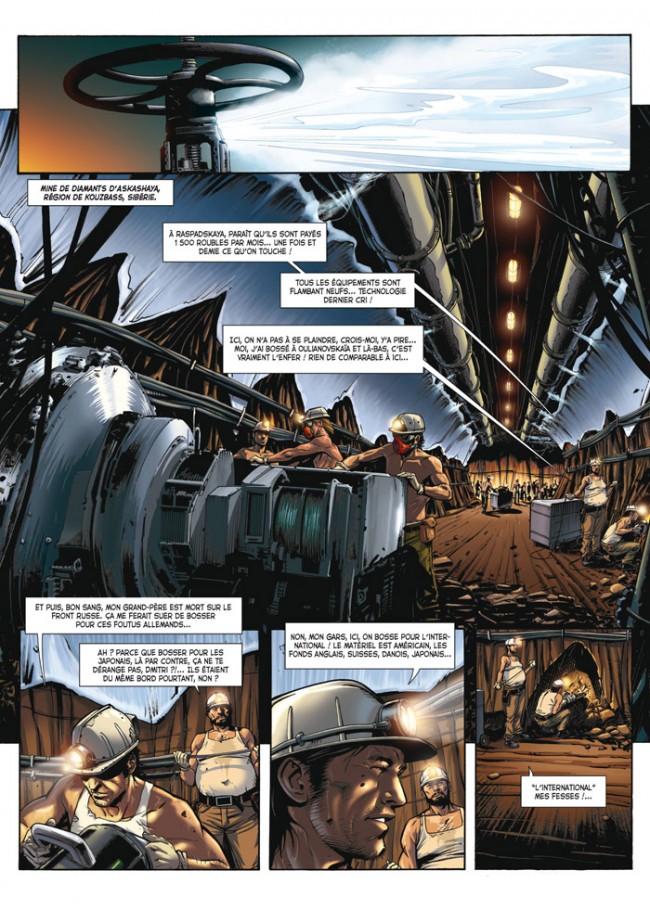 L’intrigue nous donne très vite les motivations des deux nouveaux venus : détourner la cargaison de diamants qui sort tous les deux mois de la mine, et qui avoisinent les cinq ou six millions de dollars. Bien entendu, les choses ne vont pas tourner aussi bien que prévu, et les deux lascars vont se faire blouser. Très bien, on s’en doutait. L’important, c’est le comment. Et justement, le scénario aligne les scènes de diversion qui, en fait, ne débouchent sur pas grand-chose, et au final ne servent à rien. À l’exemple de l’accident de voiture du début, qui n’est connecté à rien mais qui consomme plusieurs pages. S’il fallait décrire les personnages et faire leur portrait en creux, les scènes suivantes pouvaient s’en charger. De même, toutes les considérations sur la Russie, sa religion, sa politique, tout cela ne portera aucun fruit, et remplit les pages.