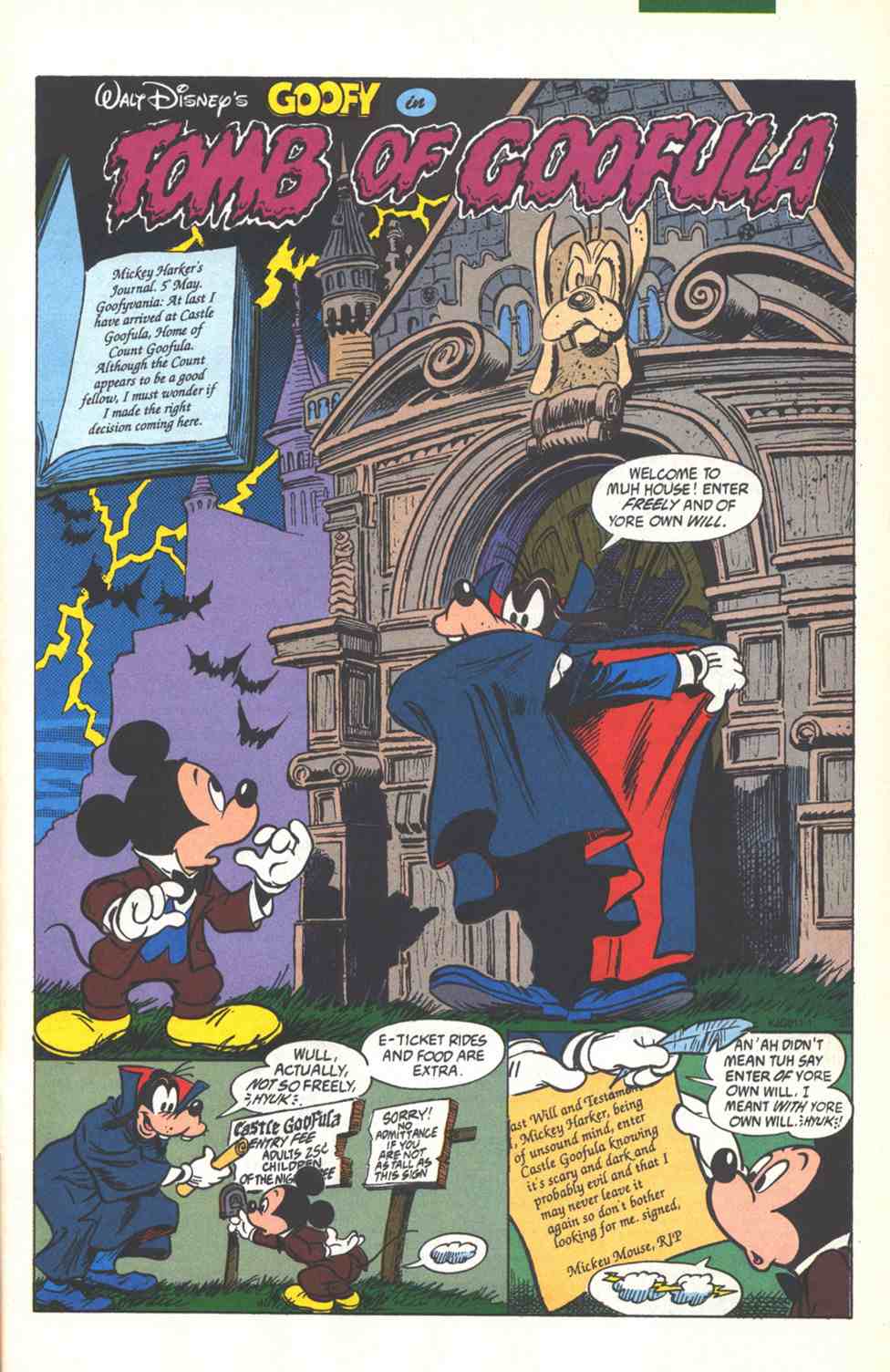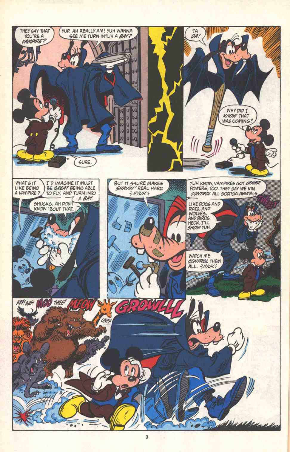 L’histoire commence alors que Mickey arrive au château de Goofula pour une interview qu’il destine à la Mouseton Gazette. L’extrait de livre en haut à gauche, la tournure des phrases et l’atmosphère renvoient au roman de Bram Stoker, bien sûr. On notera que Mickey est deux fois dénommé « Mickey Harker » (énième référence), mais que le nom au bas du testament est bien « Mickey Mouse » : erreur ou subtilité voulue ?