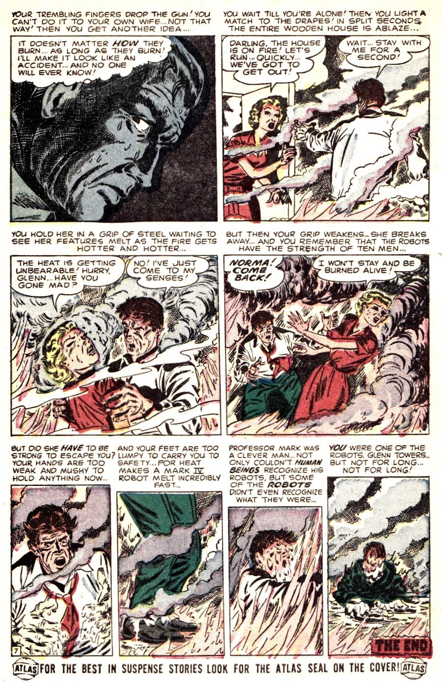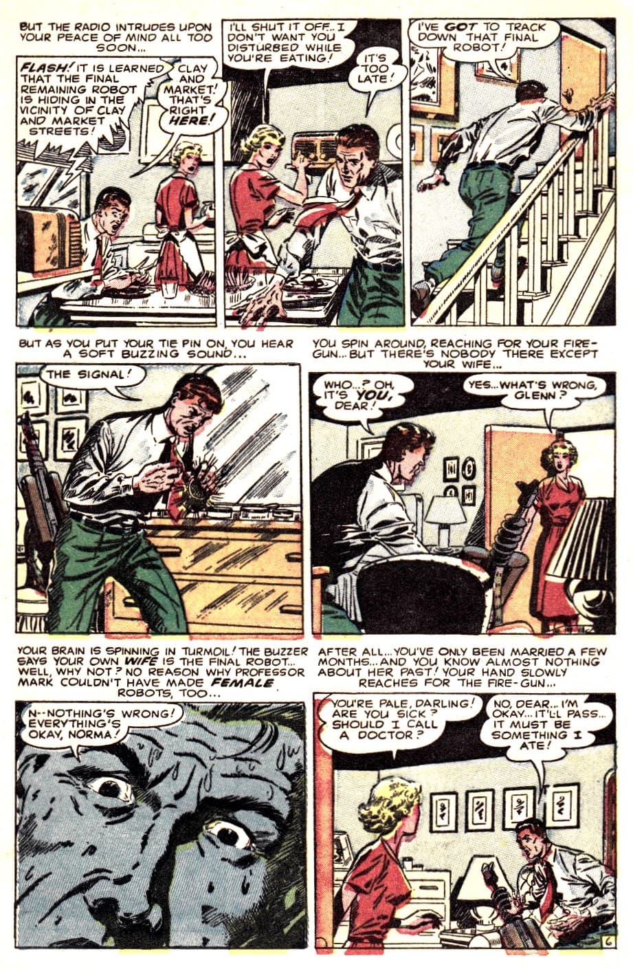 L’astuce littéraire employée par Stan Lee, c’est d’écrire à la deuxième personne, procédé que reprendra Roy Thomas ici et là dans les années 1970, et qui génère un phénomène d’identification fort. On suit donc Glenn Towers, un enquêteur qui traque des androïdes.
