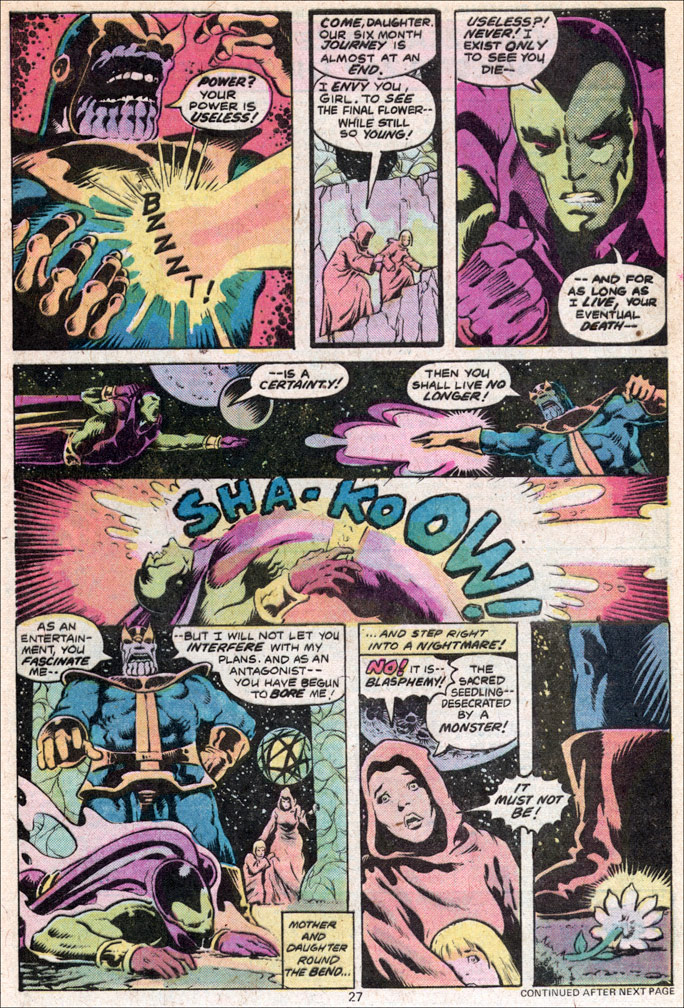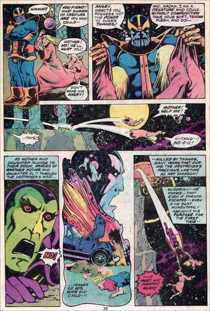 Mike Zeck : « My first color comic work for Marvel was a 5-page tryout story featuring Thanos and the Destroyer. It ran as a backup story in this issue of Logan’s run. »