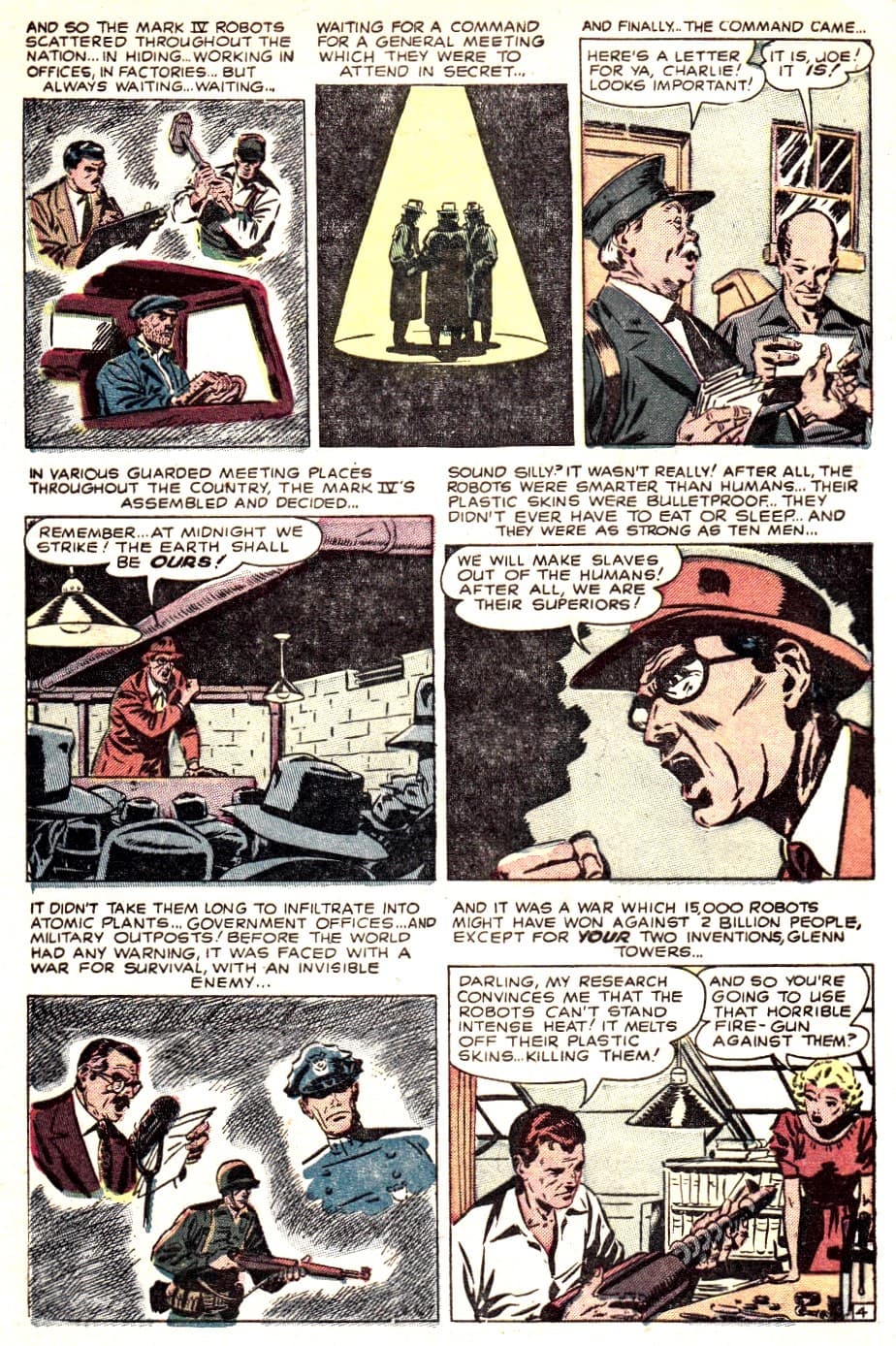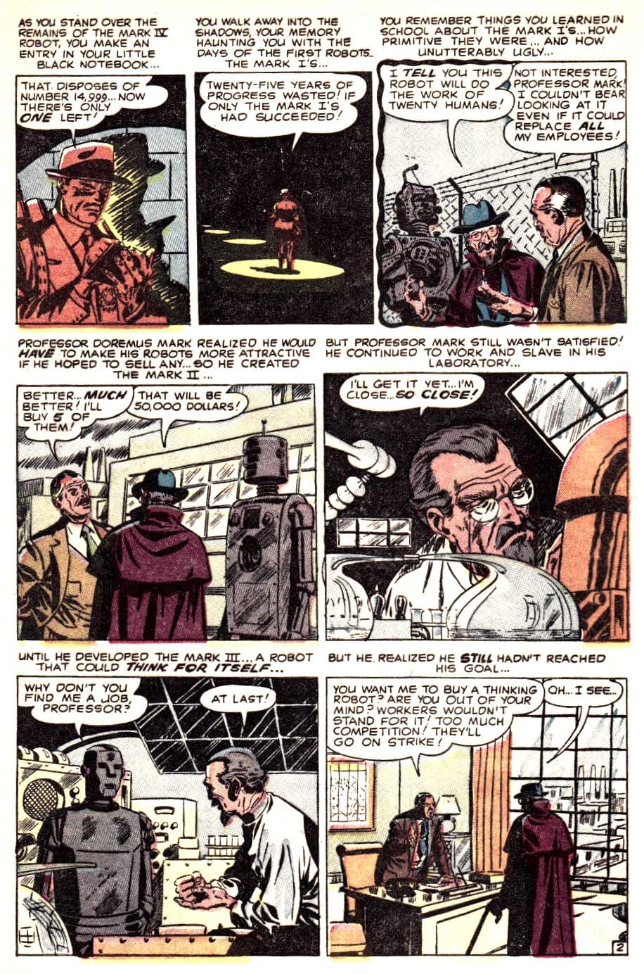 Autre point intéressant, l’avidité du monde de l’entreprise, bien décidée à virer les employés humains (donc salariés) afin de faire une plus grande marge. On retrouve ici des considérations déjà palpables dans d’autres récits de Stan Lee. Bien entendu, c’est à la mesure de quelques cases, et très rapidement, on renoue avec la vieille idée (mais qui est toujours vivace de nos jours), selon laquelle les robots pourraient fomenter une révolte et réduire l’humanité en esclavage, le tout allié à la notion de force physique (et pas d’intelligence, on n’en est pas encore là).