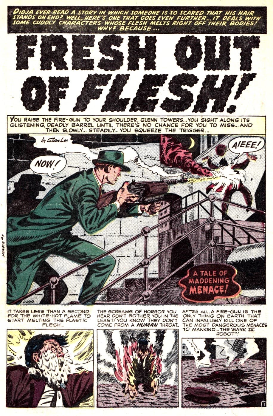 Menace #7 a déjà été évoqué dans ces colonnes pour avoir abrité une autre histoire, « The Witch in the Woods », un récit de Stan Lee et Joe Sinnott dans lequel un père lit des contes de fées à son fils avant de prendre conscience qu’ils sont plus violents et traumatisants que les comics dont son rejeton raffole.